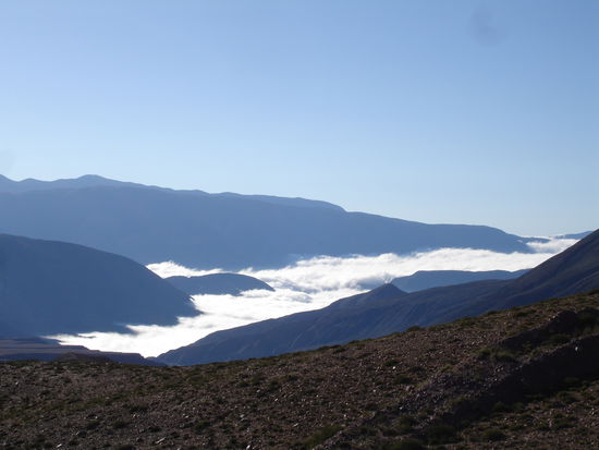 Um 7.20 fahren wir los, stahlblauer Himmel. Dann folgt ein dichtes Nebelmeer. Bei Purmamarca lichtet sich der Himmel beim Cerro de los 7 Colores.