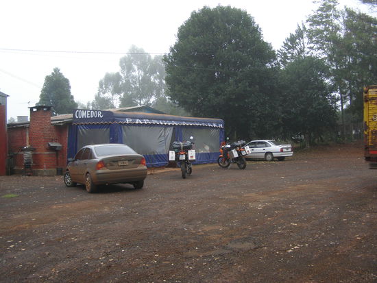 Die Weiterfahrt nach Iguazu verlief über eine wunderschöne Strecke, bergig, kurvig, Wälder, aber bei Nebel, Kälte und Näße machte die schönste Landschaft keinen Spaß. Beim Aufwärmstopp in einer urigen Parilla (typischer Imbiss mit frisch gegrilltem Fleisch) beschlossen wir den einfacheren Weg, den Fluß entlang zu nehmen. Es wurde zwar etwas wärmer, aber dafür fing es zu regnen an. So kamen wir, Mann und Motorrad mit roter Erde verdreckt in Iguazu an.