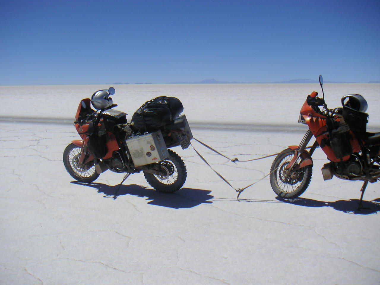 Bis zum Rande des Salzsees, dort gab es ein Salzhotel und wir hatten nicht weit bis zur Stadt um eine Lösung zu finden. In Uyuni gibt es nicht wirklich viel und in Bolivien kaum Werkstätten für größere Motorräder. Also scheint Chile die einzige Wahl. Über eine Touragentur organisierten wir ein Auto mit Anhänger für die Moto's und holperten so in 2 Tagen über 600 km Piste. Durch Berge, über Pässe, vorbei an Lagunen bis zur Grenze von Bolivien.