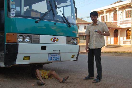 Nach 5 Stunden endlich angekommen (3,5h waren geplant) wurden wir in einen kleines Tuk Tuk gesteckt, durch halb Vientiane kutschiert zur naechsten BusStation!