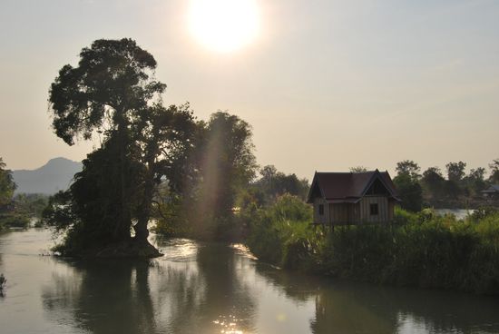 Immer am Mekong entlang, durch kleine Waelder und auf mini Wegen! Die Reise sollte auf unsere Nachbarinsel Don Khong gehen!