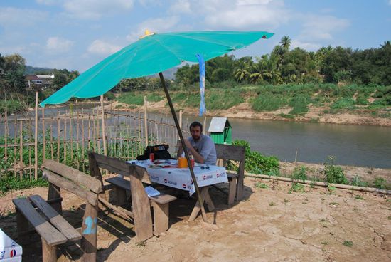 Auch hier vernachlaessigt Stefan seine Krankengymnastik nicht, wie in Deutschland aber mit Zuzahlung (Eintritt 20.000 Kip!)
