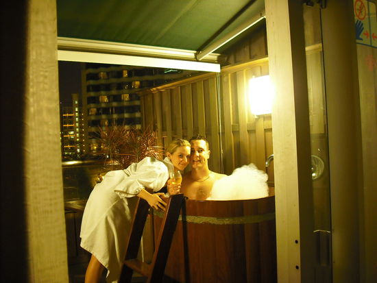 So haben wir dann gestern den Abend nach der Ankunft sehr ruhig ausklingen lassen und haben es uns nach dem Essen im Hot Tub auf dem Balkon mit Blick auf die Stadt gemuetlich gemacht.