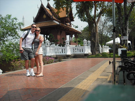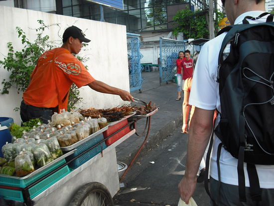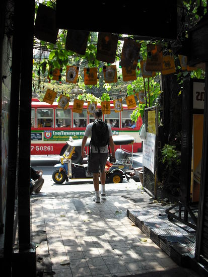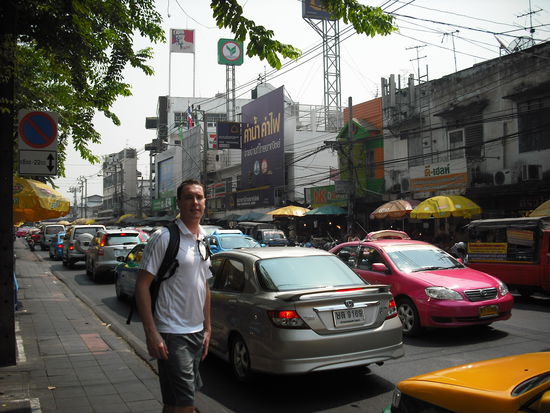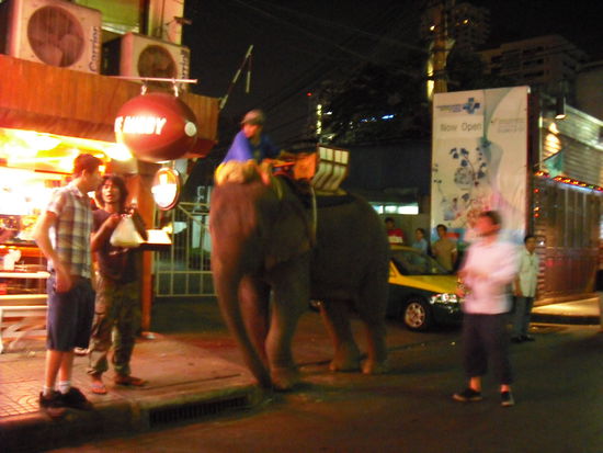 Royal Jordanian hat uns mit dem koestlichsten Flugzeugessen das ich jeh hatte, sicher nach Bangkok gebracht. Wir sind dort erst spaet, kurz vor Mitternacht angekommen..Samstag abend..es war der Teufel los auf den Strassen und es hatte immernoch 30 Grad...und inmitten des Bangkoker Nachtlebens habe ich zwischen all den Western-Thai Paerchen meinen ersten Elefanten auf der Strasse gesehen. (Er hatte sogar ein Bremslicht am Hinterteil)..