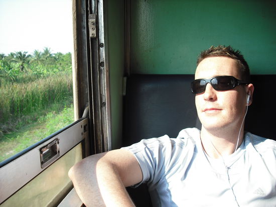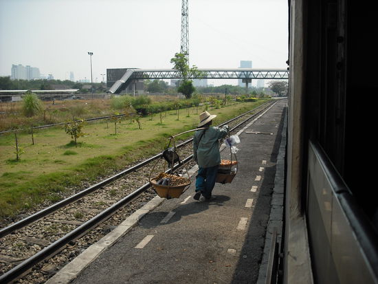 Ausserdem liefen alle 5 Minuten Thais durch die Reihen, die ihr selbstgemachtes Essen an die Zuggaeste verkauft haben. Tony hatte ein sehr gutes kleines Reis Gericht und ich habe mich dann spaeter fuer einen sehr suessen kleinen coconut Kuchen entschieden...ausserdem haben wir ungefaehr 10 Flaschen Wasser getrunken...denn das Einzigste was uns auf der Fahrt gekuehlt hat war der 40 Grad heisse Fahrtwind bei sperrangelweit aufgerissenen Fenstern.