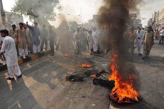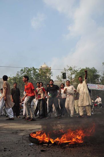 Am Morgen habe ich mich im Pool abgekuehlt und habe lange Zeit damit verbracht, meinen Rucksack zu packen - es ist wirklich unglaublich, aber jeder Handgriff war nach dieser Nacht extrem anstrengend, zumal das Quecksilber schon am fruehen Morgen wieder auf 37 Grad stieg. Erschoepft von der Hitze und der schlaflosen Nacht habe ich mich auf zur pakistanischen Grenze gemacht. Die Fahrt dorthin war leider nicht in einem klimatisierten Taxi - nein, ich habe natuerlich aus Sparsamkeit den guenstigen Lokalbus gewaehlt, der vor jedem Essensstand anhaelt um zu fragen, ob nicht doch noch einer der Speisenden zur Grenze fahren will. So dauerte die Fahrt rund 1,5 h (25 km), allerdings kam es mir vor wie ein ganzer Tag - die Luft stand geradezu, und waehrend der Fahrt hat mir der heisse Wind fast die Haut verbrannt (etwas uebertrieben). Der Grenzuebertritt verlief problemlos und Lahore empfing mich mit einem Protest - gegen was protestiert wurde weiss ich nicht, allerdings luden die brennenden Reifen und die bruellenden Maenner geradezu zu einem Photoschiessen ein. Die Maenner waren freundlich und haben brav fuer meine Bilder posiert, man muss das gefaehrliche Pakistan ja schliesslich seinem leider schlechten Ruf konform darstellen (allerdings habe ich von diesem schlechten Ruf nach 5 Wochen Pakistan nichts gesehen und gehoert).