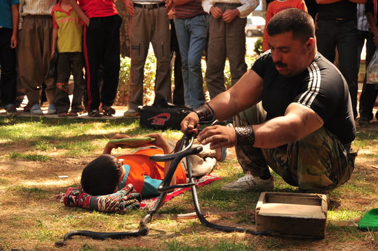 Waehrend ich durch die Stadt bummelte, lernte ich vor der Moschee zwei Maedchen kennen, die mich in einen Park mitnahmen. Wunderbare Dinge geschahen dort. Ein Glaeubiger Gaukler bat die spannend zusehenden Menschen darum, sich vor ihm niederzulegen, um mit einem Koran bewaffnet die Bisse der 5 Schlangen, die er um den Kopf der Leute Kreisen liess abzuwehren. Ob die Schlangen giftig waren oder tatsaechlich beissen koennen weiss ich nicht, aber erstaunlich war es schon, was dieses kleine Buch alles bewirkte - die Schlange schauten genauso wie der Affe im Kaefig eher schlaefrig drein, und eher harmlos als gefaehrlich. Nun ja, das liegt wiederum am Fastenmonat, auch Tiere duerfen nicht essen, oder verstehe ich da etwas falsch ? Ramadhan ist in Kermanshah anders als in Teheran: ich war aeusserst erstaunt, dass sich in einigen Sandwichbuden speisende Gaeste zum Mahl zusammenfanden - das haette ich im Iran nicht erwartet, und auch zum ersten Mal gesehen. Tagh e Bostan, eine Steinmeislerei aus einer Zeit vor Christus (rund 400 Jahre) war eine interessante Sehenswuerdigkeit, die am vergangenen Mittwoch auf meinem Programm stand. Die vielen netten Kurden waren stets gespraechig und gesellig, und so war ich niemals alleine. Touristen habe ich nun seit einem ganzen Monat nicht mehr gesehen, und ich rechne mit dem naechsten fruehestens in der Tuerkei in Goereme wo ich hinreisen moechte.