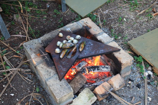 ...unser Barbecue am Abend auch. Frische Muscheln, Snapper und Chicken vom Grill. Wein aus Australien! Dips. Die ganze Pallette und am allerwichtigsten: Nette Leutchen
