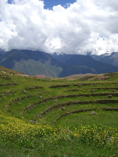 Die Ruinen von Moray dienten den Inkas hoechstwahrscheinlich als eine Art biologisches Labor.Da jede Ebene der kreisfoermigen Terrassen ihr eigenes Mikroklima hat,konnten die Inkas die Mulden nutzen,um die optimalen Bedingungen fuer den Anbau der einzelnen Pflanzen herauszufinden.