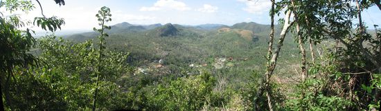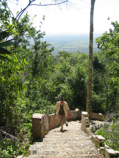 Irgendwann dreht sich der Weg um den Berg und wir sind in der prallen Mittagssonne; dies nutzen dann einige zum Verkauf von Erfrischungen und Souvenirs, die sie hier hoch schleppen mußten. Wir erfrischen uns mit einer Trink-Kokosnuss und bewundern den weiten Blick nach Süden in die Ebene.