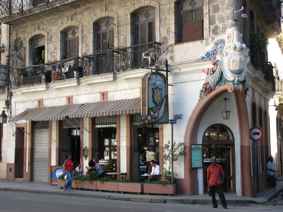 Da wir dringend eine Kaffeedröhnung brauchen, machen wir neben der noch geschlossenen legendären El-Floridita-Bar an der Grenze zwischen Altstadt und Centro eine kurze Pause und beobachten das lebhafte Treiben mit den uns unbekannten Oldtimern und den lustigen Cocos.