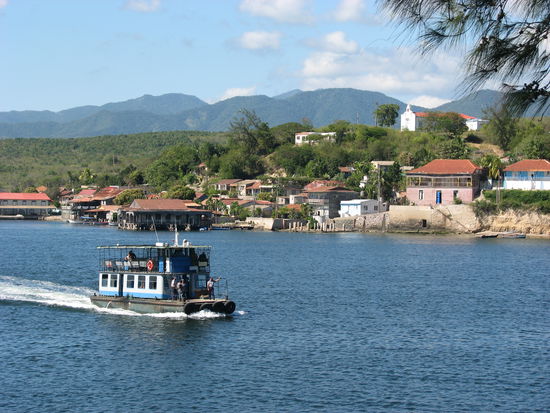 Nach der Besichtigung schauen wir uns das Lokal El Morro mal an, da es auch von Baedeker empfohlen wird wegen seiner guten kreolischen Küche. Von der Terrasse hat man einen ähnliche tollen Blick auf die Bahia de Santiago und die Wälder der Sierra Maestre wie von der Festung. Aber es noch zu früh zum Essen. Daher starten wir durch und fahren zur inzwischen ausgeschilderten Anlegestelle nach Punta Gorda.