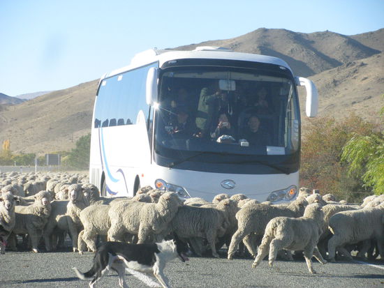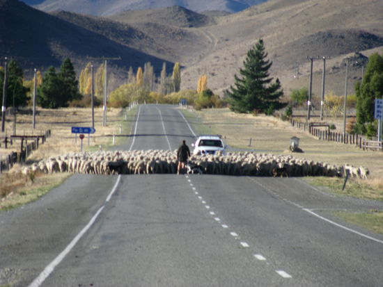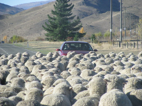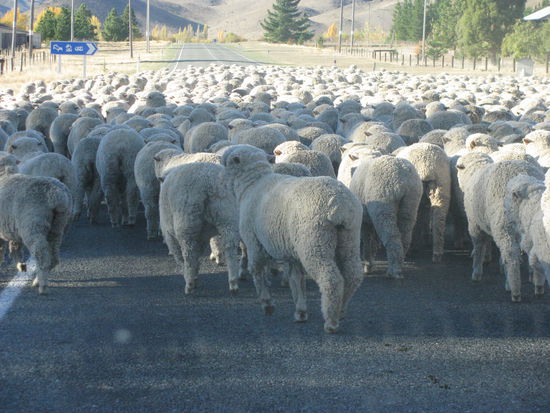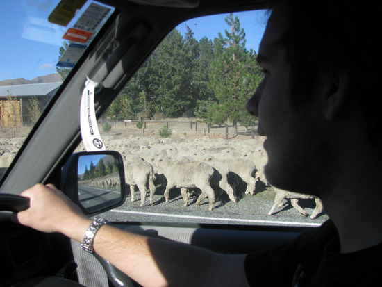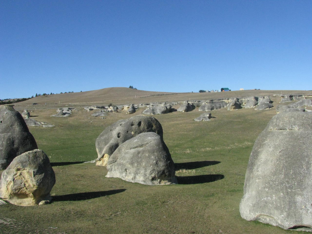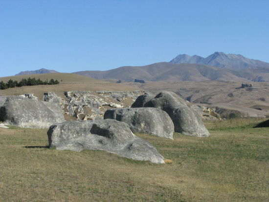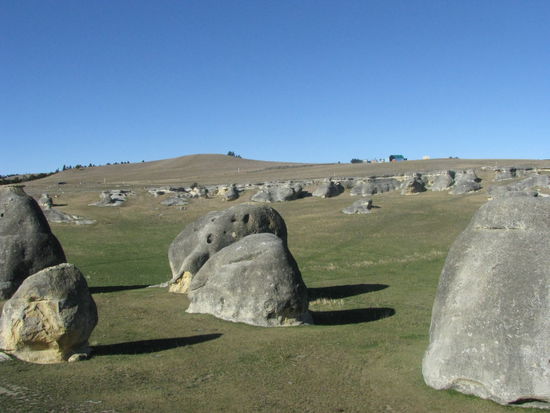 Um kurz vor 7 waren wir ausgeschlafen und bereit weiter zu reisen. Dies taten wir auch. Wir begaben uns auf den Weg runter vom Mount Cook, bevor wir frühstückten. Erst als wir einige Zeit später 60 Kilometer weiter wieder in Twizel waren, tankten wir und frühstückten im Van auf dem Marktplatz. Dort machten wir auch die Pläne für den kommenden Tag. Zuerst würden wir Richtung Elephant Rocks fahren, bevor wir dann unsere Reise nach Christchurch fortsetzten würden. Jedoch wurden wir etwas von ein paar hundert Schafen aufgehalten. Diese wurden von einer Weide auf die andere über den Highway getrieben und wir befanden uns plötzlich mittendrin. Allerdings waren wir total begeistert, immerhin ist Neuseeland das Land der Schafe und wir hatten insgeheim gehofft, dass uns sowas jemals passieren würde. Nach etwas mehr wie einem Kilometer konnten wir dann wieder normal fahren. Beinahe wären wir dann auch an den Elephant Rocks vorbeigefahren, da sie unser Reiseführer anders ausschrieb. Wir fanden sie dank guter Schilder dann aber doch. Erneut schätzten wir Neuseeland, da obwohl diese Steine auf Privatland lagen, konnte man dieses kostenlos betreten. Die Kalksteine waren riesig. Eigentlich kein Wunder warum sie Elelfantensteine genannt werden. Und einer hatte sogar mit etwas Phantasie die Form eines Elefanten. Nach einer kurzen Pause ging es dann wieder ins Auto und die 240km weiter nach Christchurch. Dort angekommen war es bereits fast dunkel, wodurch wir nichts anderes mehr taten als uns Abendessen zu kaufen und uns einen Schlafplatz zu suchen. Wir fanden einen schönen Platz mit Duschen, wenn auch kalter. Dort trafen wir zwei andere Backpacker, die uns erzählten, dass wir hier willkommen seien, da die Leute des neuseeländischen "DLRG", lieber Backpacker an ihrem Parkplatz über Nacht hätten als einheimische Jugendliche, da diese oft randalierten. So schliefen wir auf einem Parkplatz neben einem Stand mit Stranddusche.