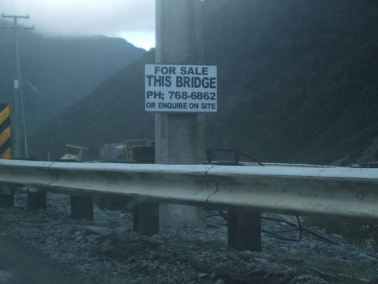 Den kommenden Morgen wurde noch einmal geduscht, immerhin wussten wir ja nicht wo wir wieder eine kostenlose Dusche finden würden. Als alles gepackt war, begaben wir uns an unseren Parkplatz vom Vortag. Diesmal wollten wir nicht lange in Christchurch bleiben. Der Plan war eine Weile mit dem Laptop kostenlos unsere Emails zu checken und dann den Reisebericht weiter hoch zu laden. Um 13:00 Uhr machten wir uns dann mit vollem Tank auf den Weg nach Hokitika. Die Reise führte uns einmal quer über die Südinsel. Wir überquerten den wunderschönen Arthur's Pass, der unserem Auto einiges abverlangte. Es meisterte die Aufgabe jedoch mit Bravour. Auf der Fahrt amüsierten wir uns einige Male über den Einfallsreichtum der Neuseeländer. Wir sahen den wohl einzigen umgeleiteten Wasserfall der Welt und ein Zeichen, das eine alte Brücke zu verkauf stände, da nebendran eine neue gebaut wurde. Wer in der Welt kauft schon eine kleine, alte Brücke?! Wir benötigten den Rest des Tages für unsere Reise, jedoch genossen wir die Landschaft und die Freiheit. Abends in Hokitika angekommen stellten wir unser Auto dann auf einen DOC-Campground.