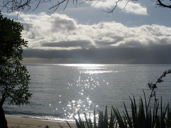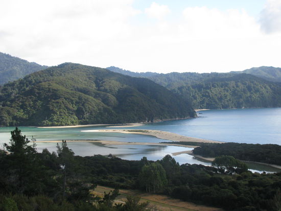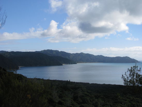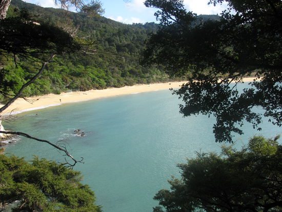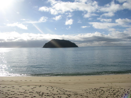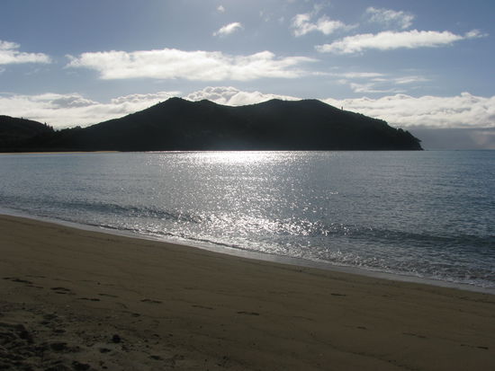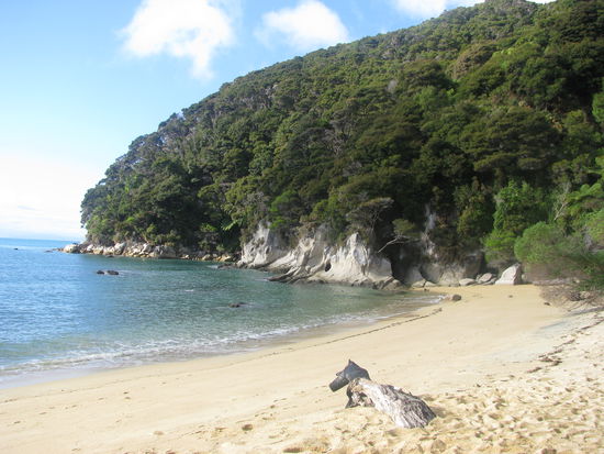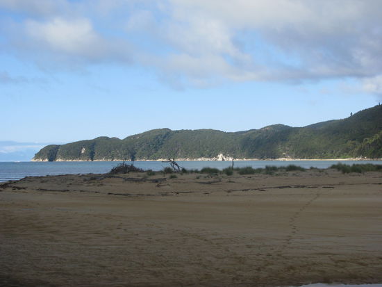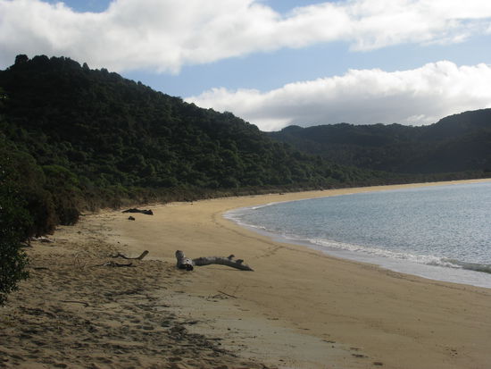Als um 6:00 Uhr Lauras Wecker klingelte, war wohl jeder kurz oder lang im Schlafraum wach. "Horrorpops" dröhnten mit voller Lautstärke aus ihrem Handy und da dieses in einem kleinen Säckchen, das im Schlafsack eingenäht war verstaut war, dauerte es eine Weile, bis sie es nach draußen gefischt hatte. Danach ging es geschwind mit all unseren Sachen und möglichst leise in den Gemeinschaftsraum. Dort packten wir unsere Schlafsäcke und ähnliches ein, während Wasser für Tee zum kochen gebracht wurde. Die ganze Aktion wurde allerdings durch das Dunkel der noch andauernden Nacht erschwert. Robin duschte noch draußen im Wald, auch wenn es stockfinster und kalt war (Die Dusche, sowohl als auch die Außentemperatur.). Gegen halb 7 ging dann langsam die Sonne auf und wir setzten uns an unser Frühstück. Um Punkt 7 ging es dann nach draußen los, mit neuem Mut und gepackten Sachen. Allerdings verließ der Mut Laura schnell wieder. Wir gingen über die erste gezeitenabhängige Stelle und zu Lauras Missfallen mussten wir feststellen, dass nicht alles ausgetrocknet war. Schon nach kurzer Zeit standen wir vor einer Stelle an der das Wasser wohl noch etwa Knietief sein würde. Also hieß es Schuhe und Socken aus und rein in das nasse Vergnügen. Nachdem Laura den ersten Zeh ins Wasser getaucht hatte, gab sie einen entsetzten Schrei von sich. Das Wasser war, Entschuldigung für die Form, saukalt! Nichts desto trotz mussten wir hindurch, immerhin leuchtete auf der anderen Seite der "Pfütze" der riesige orangene Wegweiser, der anzeigte, dass dort der Track weitergehen würde. Endlich durch das Wasser durch, waren wir uns zuerst nicht sicher ob wir Richtig waren, da wir keinen Track finden konnten. Jedoch machten wir zuerst einmal unsere Füße sauber und zogen wieder Socken und Schuhe an. Außerdem hoffte Laura darauf, dass ihre vom kalten Wasser entstanden Gänsehaut schnell wieder nachlassen würde. Robin, der scheinbar immun gegen kaltes Wasser ist, amüsierte sich köstlich über Lauras Probleme. Jedoch fand Robin den weiteren Track und schon marschierten wir wieder. Nach gut einer weiteren Stunde bergauf und bergabgehen durch den Wald, kamen wir dann an eine großes Stück wunderschönen reinen, weißen Strand. Am liebsten wären wir dort ewig geblieben, aber knapp 12km standen auf dem Tagesprogramm und die wollten nun mal beendet werden. Nach einer kurzen Pause in der Sonne am Strand, gingen wir weiter. Wir erfuhren außerdem, dass wir mal wieder Glück hatten, denn eigentlich waren wir hier strikt auf die Tide angewiesen. An einer Stelle konnte man den Track nur bei Ebbe fortführen und wir waren etwa knapp drei Stunden nach der Ebbe da, was etwa der Zeit entspricht an der die Stelle wieder unpassierbar wird. Wir entschlossen uns unser Glück dennoch zu versuchen, da uns der Mut auch nicht nach vier Stunden warten bis zur nächsten Ebbe stand. Nach kurzer Zeit kamen wir an besagter Stelle an. Wir sahen, dass in der Mitte des Wassers noch eine Sandbank war, die unsere Chancen erhöhte mit Schuhen trockenen Fußes auf die andere Seite zu kommen. Gerade als Robin, der wie immer, vorging, beide Füße auf die Insel gestellt hatte, kam eine Welle und das scheinbar zurückfliesende Wasser lies die "Insel" untergehen. Robin konnte gerade noch so trockenen Fußes entkommen. Jetzt fing die Zeit an zu drängen, da wir nun eilig auf die andere Seite kommen mussten, bevor uns die Flut einholen würde. Robin fand dann durch Zufall einen Baumstamm, der umgefallen war. Dieser war zwar etwas morsch, aber noch gut genug uns beide trockenen Fußes auf den befestigten Track zu bringen. Leider hatte Robin nicht den Luxus die Füße trocken zu behalten sondern trat einmal in ein etwas schlammiges Sandfeld. In diesem sank er fast knietief ein, so dass sein einer Fuß ziemlich nass wurde. Fröhlich ging es den bergauf weiter. Um kurz nach 12 waren wir bereits in der Nähe der Hütte. Wir mussten nur noch eine scheinbar ewige Strecke am Strand entlang hinter uns bringen. Wieder kamen wir an schönen Privathäusern vorbei. An der Hütte angekommen waren wir erneut die Ersten. Die Hütte war wieder mit Dusche, was Robin, im Gengensatz zu Laura, erneut zu wissen nutzte. Laura hingegen legte sich nach dem Mittagessen erst einmal eine Stunde oder mehr schlafen, da sie total müde war und zugleich fror. Als Robin Laura weckte, hatte er kleine Tomaten gefunden. Mit einiger Überredungskunst konnte er Laura auch aus dem Bett bekommen, so dass ihr mit ein wenig spazieren gehen wieder warm werden konnte. Gegen 16:00 Uhr kamen dann die nächsten Wanderer und um 19:00 Uhr war das Haus genauso voll wie am Vorabend. Wir machten uns wieder früh unser essen und gingen um 19:00 Uhr total kaputt ins Bett, da der nächste Tag wieder um 6:00 Uhr beginnen sollte.