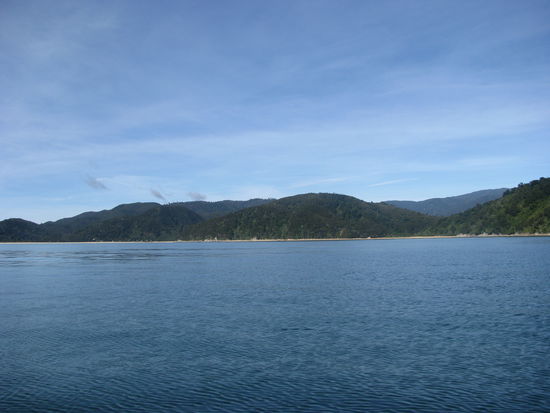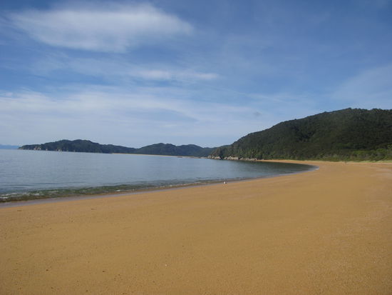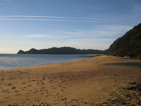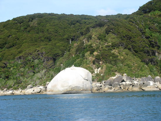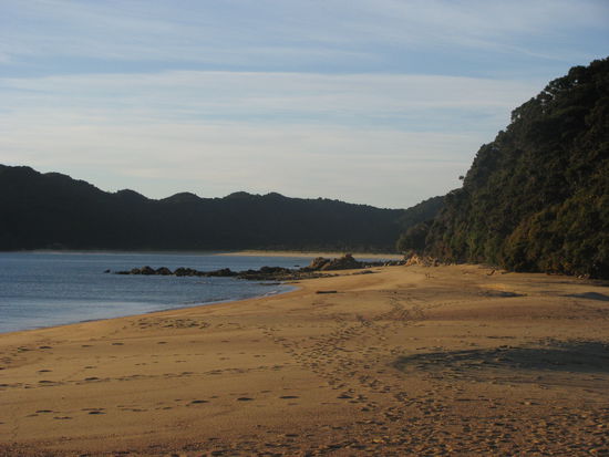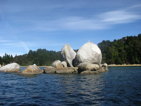Wie wir bereits gestern erwähnt hatten, mussten wir auch heute wieder um 6:00 Uhr aus den Federn. Allerdings waren wir diesmal nicht allein. Kurz nachdem wir aufgestanden waren, schien die ganze Hütte aktiv zu werden. Jeder war heute irgendwie von den Gezeiten abhängig, wodurch alle früh aufstehen mussten. Um kurz nach 7 hatten wir all unser Zeug fertig und waren bereit für den Tag. Heute waren wir mit einer Hamburgerin zusammen die einzigen, die sich in die nördliche Richtung aufmachten. Wir mussten zuerst mal wieder das Meer überqueren. Allerdings war es diesmal eine riesige Fläche und wir benötigen allein hierfür über 20 Minuten um die Strecke zu bewältigen. Wieder wurden unsere Füße ziemlich nass. Jedoch war es diesmal nicht so schlimm wie gestern Morgen, da das Wasser wesentlich niedriger war. Wir mussten uns aber beeilen, da die Flut wenige Minuten nach unserem überqueren zurückgekommen wäre. Das beeilen war teilweise auch leichter gesagt als getan, da überall Muscheln lagen, die barfuß ganz schön weh taten. Gemütlich brachten wir die letzten 5,5 km hinter uns. Diesmal war Laura die Erschöpfung deutlich anzumerken und ihre riesigen Blasen an den Füßen machten die Wanderung nicht unbedingt angenehmer. Die restliche Strecke hatten wir schon um kurz nach 9 hinter uns gebracht. Somit entschlossen wir uns das Wassertaxi anzurufen und unsere Rückfahrt auf den früheren Abholungstermin zu verlegen. Für das Unternehmen war das kein Problem und uns ersparte es vier Stunden warten. Da wir immer noch über eine Stunde Wartezeit hatten, legte sich Laura an den Strand, allerdings von oben bis unten mit Kleidern abgedeckt, als Schutz gegen die miesen Sandflies. Robin hingegen suchte irgendwann das weite, da ihm die kleinen Biester zu sehr auf den Wecker gingen. Überpünktlich wurden wir von unserem Taxi abgeholt. Wir freuten uns sehr darüber und stiegen ein. Kurz nach dem Ablegen wurde uns gesagt, dass wir noch einen Umweg machen würden ,da es darum ginge einen Verletzten an einem anderen Hafen in der Nähe abzusetzen. Zu unserer Überraschung war dieser Verletzte nicht einmal mit unserem Unternehmen unterwegs, sondern mit einem rivalisierenden. Wir nahem die beiden Passagiere, ein Ehepaar auf Hochzeitsreise auf und fuhren los. Zu unserem Glück sahen wir dann auf dem Rückweg von dem Hafen zu unseren Marina den Split Apple. Einen riesigen runden Stein, der mitten im Meer steht und aussieht wie ein Apfel, der in der Mitte gespalten worden war. Unser Skipper erklärte uns, dass dieser Stein schon in einigen internationalen Werbungen verwandt worden sei. Kurze Zeit später kamen wir an unserer Anlegestelle an. Dort wartete ein Traktor mit Anhänger auf uns. Wir fuhren mit dem Boot auf den Anhänger und wurden dann so zu unserem Camp transportiert. Dor angekommen waren wir heilfroh unser Auto zu sehen. Wir packten unsere Sachen in den Van, holten die eingelagerten Wertsachen im Büro ab und fuhren dann nach Nelson. Dort wuschen wir unsere Kleider und danach uns. Zum Abendessen gönnten wir uns eine Pizza von Hell. Mit vollem Bauch ging es müde zu Bett.
