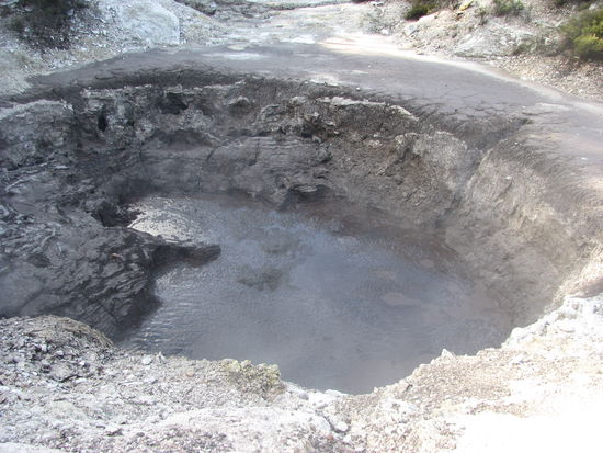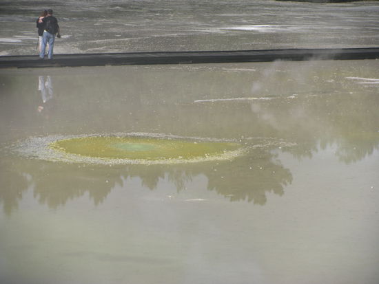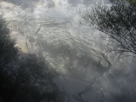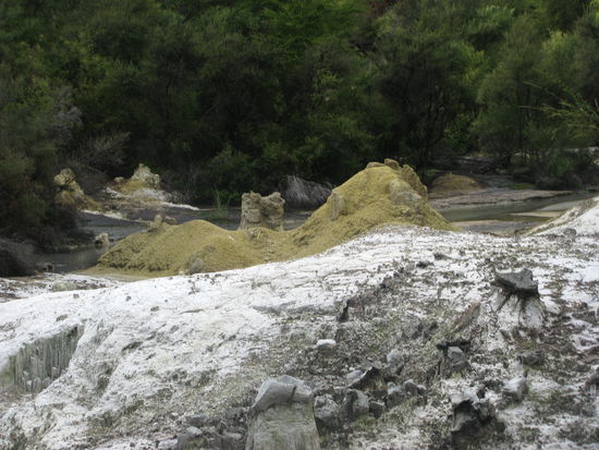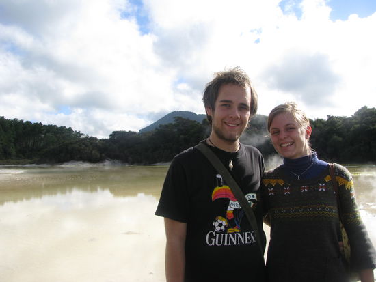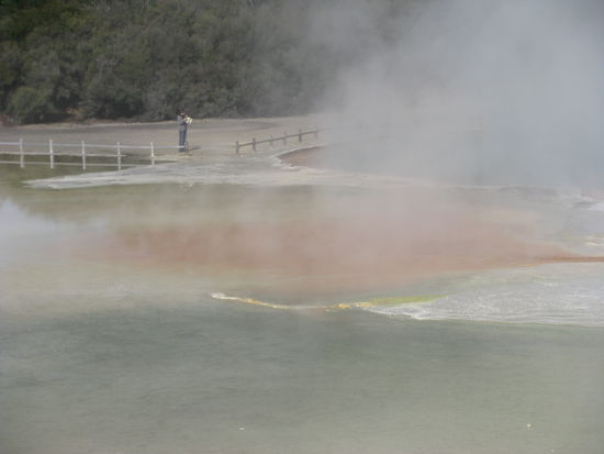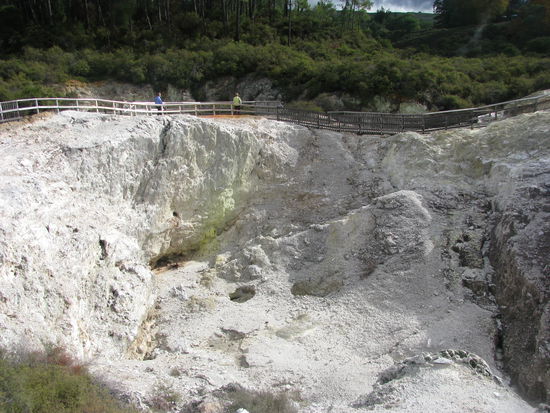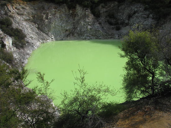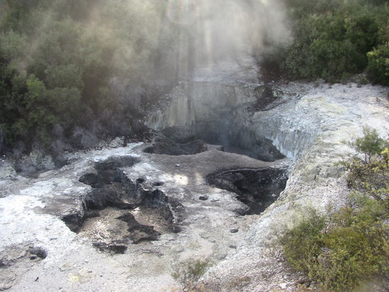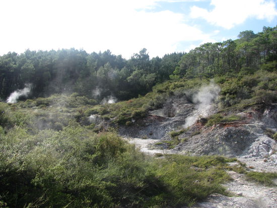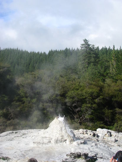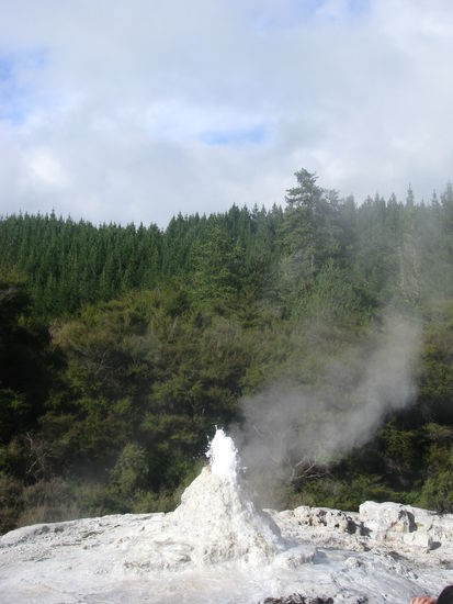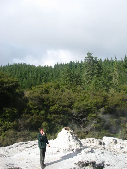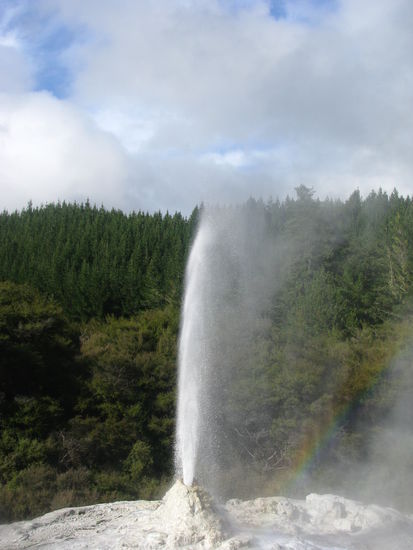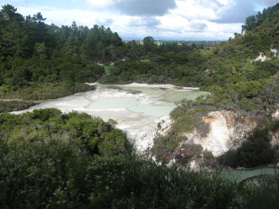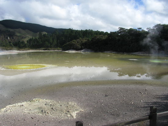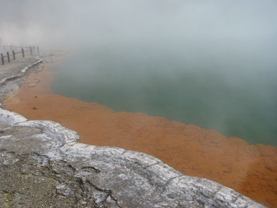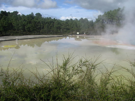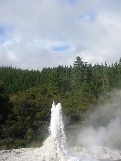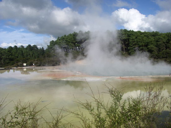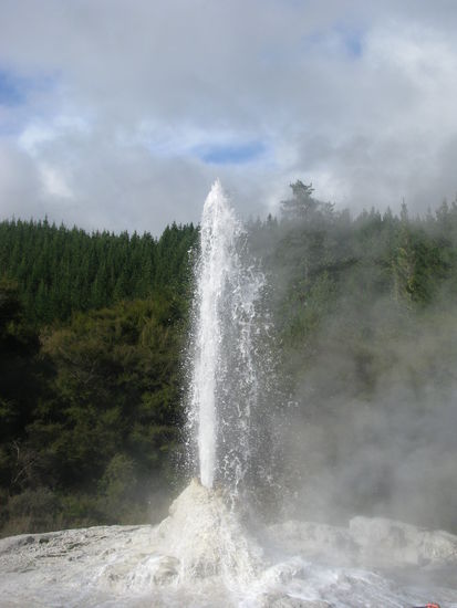 Nachdem wir gut ausgeschlafen hatten begaben wir uns gemütlich auf den Weg zum Wai-O-Tapu Thermal Wonderland. Hier sollte uns klar werden, warum es in Rotorua so grässlich stinkt (laut Robin). Rotorua liegt auf einem geothermal extrem aktiven Gebiet. Dies führte allerdings auch zu seiner Berühmtheit unter den Touristen, da es viele heiße Quellen und Schlämmbäder gab. Allerdings verfolgte hier einen auch der Geruch von Hydrogensulfid (faulen Eiern) auf Schritt und Tritt. Je nachdem wo man sich befand war der Geruch mal stärker und mal schwächer. Für Robin war es unerklärlich, wie jemand mit gesundem Verstand hier freiwillig leben konnte. Das Wai-O-Tapu ist das neue Thermale Wunderland nachdem das erste vor über 120 Jahren durch einen Vulkanausbruch zerstört wurde. Bevor wir uns das eigentliche Wunderland ansahen begutachteten wir allerdings noch das Lady Knox Geysir. Dieser brach mit Hilfe von ein wenig Seife immer zur selben Uhrzeit aus. Normalerweise würde der Geysir in einem Intervall von 24 bis zu 36 Stunden immer ausbrechen. Da dies nicht sehr zuschauerfreundlich ist kam man auf die Idee mit natürlich abbaubarer Seife den Geysir zu starten. So fand man damals auch den Geysir. Zwar ist die thermische Spannung des Wassers immer vorhanden, jedoch wird die Spannung durch die Seife gebrochen und der Geysir bricht aus. Zur Zeit der Entdeckung des Geysirs wurden in der Nähe Bergarbeiten verrichtet und die Arbeiter wuschen ihre Kleidung in der kleinen heißen Quelle, die an der Stelle des Geysirs zu Tage sprudelte. Eines Tages viel einem Arbeiter seine Seife in die Quelle und diese schoss in einer über 30 Meter hohen Fontäne nach oben. Da das Wasser ziemlich kalkhaltig ist hat sich über die Jahre immer mehr Kalkstein abgelagert und dadurch entstand eine Art Krater aus der die ehemalige Quelle nur noch als Geysir ausbricht. Der Geysir sprudelt mehr als eine Stunde und die höchste Höhe, die die Fontäne erreicht sind 30 Meter. Nachdem wir uns das Treiben eine Weile angesehen hatten entschlossen wir den Geysir hinter uns zu lassen und lieber in Ruhe durch den Park zu spazieren. Die erste Station waren der "Wetter Pool" und die "Krater". Der Pool ändert seine Farbe entsprechend des Wetters und da wir in der Nacht davor Regenfall hatten und das Wetter nicht gerade das schönste war erschien er uns etwas wolkig. Bei Sonnenschein hätte er eine grau-grüne Färbung gehabt. Die Krater sind bis zu 50 Meter im Durchmesser und manche sind sogar 20 Meter tief. Sie entstanden über die letzten Jahrhunderte durch säurehaltigen Dampf, der von superheißem unterirdischem Wasser abgegeben wurde. Die Erde über dem Wasser löste sich langsam auf und kollabierte letztendlich womit sie einen Krater formte. Aus diesem Grund enthalten auch viele Krater heiße Quellen. Als nächstes und eigentlich erste Attraktion des Parks kam des "Teufels Haus". Dies war ein gutes Beispiel für den zuvor beschriebenen Prozess; auffällig ist die gelbe und grüne Färbung der Innenwände, die durch austretende vulkanische Gase entstanden. Das Gelb und die grüne Farbe sind Schwefelverbindungen. Als nächstes sind der Regenbogenkrater und der Donnerkrater an der Reihe. Der Donnerkrater ist der jüngste Krater und entstand im Jahre 1968, was erneut ein gutes Beispiel der extremen geothermalen Aktivität der Gegend ist. Als nächstes waren die "Farbtöpfe des Teufels" an der Reihe. Dies war eine Reihe von Schlammlöchern, die Aufgrund ihrer unterschiedlichen chemischen Konsistenz diverse Schwarzfärbungen aufwiesen. Die nun folgende "Farbpalette eines Artisten" war da schon eine ganz andere Geschichte, die in jeder nur erdenklichen Farbe schimmerten je nachdem wie die Sonne auf sie traf. Die Auswahl reichte über die ganze Palette des Regenbogens. Der Opal Pool, der seinen Namen aufgrund seiner gelbgrünen Farbe erhalten hatte wurde von den anliegenden Pimrose Terrassen gespeißt und besteht gleichzeitig noch aus einer kleinen schwefelhaltigen Quelle. Die Pimrose Terrassen entstanden über die letzen 700 Jahre und sind weiterhin am wachsen. Sie gelten als sehr zerbrechlich und bedecken durch ihre Konservierung inzwischen ein Fläche, die etwa 1,5 Hektar beträgt. Nebenan liegt, der Jean Batten Geysir, der während unseres Aufenthaltes eher weniger Interessant für uns war, da wir bereits den Lady Knox Geysir gesehen hatten. Unser weiterer Weg brachte uns an einem Ausguck vorbei bevor wir zu den "Brautschleierfällen" kamen. Der Name ist wirklich passend, da es sich hierbei nicht um einen typischen Wasserfall handelte, sondern um ein Gebilde aus vielen kleinen Wasserfällen, die jedoch Großteils über hellen Stein flossen. Die "Bratpfannenebene" war als nächste an der Reihe gefolgt vom "Austernpool" und der "Schwefelhöhle". Der Name des Austernpools entstand aufgrund seiner Form. Diese erinnert stark an eine halbe Auster, die auf der Schale liegt. Als nächstes war der Wasserfall des Sees Lake Ngakoro an der Reihe, der See entstand nach einer großen Eruption vor über 700 Jahren und der noch heute auftauchende Dampf aus der Erde ist ein weiteres Zeichen der vulkanischen Aktivität des Landes. Nach einer kurzen Pause ließen wir den Wasserfall hinter uns und begaben uns auf den letzten Teil der Wanderung. Die nächste große Attraktion waren die Champagner Pools. Diese Quelle ist die größte der Region mit einem Durchmesser von über 62 Metern und einer Tiefe von 65 Metern. Die Wasseroberfläche hat eine Temperatur von 74°C während es unter der Oberfläche weit heißer wird. Die aufsteigenden Blasen stammen von Kohlenstoffdioxid, während die extrem eigene Färbung eine andere Ursache hat. Diese entsteht durch die vielen Stoffe, die im Wasser sind und sich an den Rändern anlagern. Unter anderem findet man in dem Wasser kleinste Anteile von Gold, Silber, Quecksilber, Schwefel, Arsen, Thallium, Antimon und viele Weitere. Danach kamen noch der Infernokrater, der Vogelnestkrater (dieser erhielt seinen Namen,