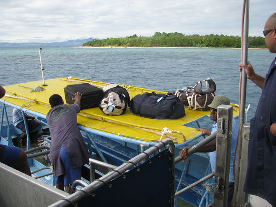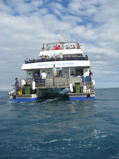 Am Hafen angekommen stiegen wir aus und bekamen Anweisung, wo wir unser Gepäck hinbringen sollten, sowie wo wir uns anstellen sollten um unsere Tickets für die Fährfahrt zu bekommen. Da wir noch ein wenig Zeit hatten, kauften wir uns danach noch je einen Sulu und Wasser. Robin wählte einen Männersulu, während Laura sich für einen bunten Sulu mit sehr vielen Schildkröten entschied, in welchem jedoch die Grüntöne dominierten. Wasser kauften wir, weil wir zuvor erfahren hatten, dass nicht jede Insel trinkbares Wasser aus dem Wasserhahn anbot, weil auf manchen Inseln Frischwassermangel herrschte. Wir kauften das Fijiwasser, was besonders Laura freute, da sie dieses bereits aus den USA kannte, dort aber nie probieren konnte, weil dort bereits eine kleine Flasche über US$ 5 gekostet hatte. Das Wasser schmeckte ganz gut, wenn es auch einen komischen undefinierbaren Beigeschmack hatte.