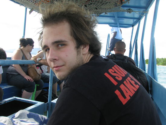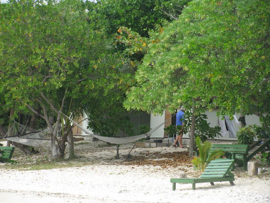 Unsere Bure (Hütte) war wirklich geräumig und sauber. Wir zogen uns jedoch nur schnell um und gingen dann zum Essen. Zu Mittag gab es wirklich feine Salate, frisches Brot und Würstchen, sowie einige Stücke Fleisch. Wirklich zufrieden mit dem Essen machten wir ersteinmal eine kleine Pause. Danach entschlossen wir uns ein Kayak auszuleihen, da langsam die Ebbe anfing und somit das Wasser zurückging. Schnorcheln wurde dadurch unmöglich, weil man die Korallen zerstören könnte und sich weh tun könnte. Wir wollten einmal die Insel umrunden, was jedoch ein wenig schwierig war, weil der Wind ziemlich stark ging und wir zuerst gegen diesen Anfahren mussten. Leider war das kayaken nicht so einfach und wir liefen nach kurzer Zeit zweimal auf Land auf. Laura schob jedesmal das Boot wieder auf das Meer hinaus. Wobei beim zweiten Mal das Unglück passierte. Als sie an dem Boot zog muss sie irgendwie mit ihrem Fuss an eine Koralle gekommen sein, die durch die Ebbe weiter nach oben stand. Dort schnitt sie sich die Zehen und einen Teil ihres Fusses an. Der Schmerz war ziemlich unangenehm und da es anfing zu bluten begaben wir uns auf den Rückweg, der deutlich einfacher war, da nun der Wind für uns arbeitete und uns anschob. Als wir wieder an Land waren ließen wir das Kayak stehen und gingen direkt zu dem Shop von Reef Safari, die sich um alles kümmerten, was mit Wassersport zu tun hatte. Dort wurde der Fuss erst einmal mit Essig gereinigt. Zu Lauras Erstaunen, brannte dies garnicht. Danach kam noch eine gute Portion Iod drauf, die hingegen gut brannte. Anweisung war, dass Laura eine Weile lang nicht ins Wasser durfte und nach jedem Schwimmen ihren Fuss wieder desinfizieren sollte, da Korallenschnitte hochinfektiös sind. Somit gaben wir das Kayak zurück und legten uns ein wenig in die Hängematte, wo wir unsere Bücher lasen. Da dies schon bald zu langweillig wurde, zog sich Laura eine Socke über den Fuß. Somit gut gegen den Sand gerüstet machten wir uns auf den Weg die Insel einmal zu umrunden. Da wir auf unserem Weg um die Insel noch einen Engländer trafen, mit dem wir eine Weile redeten dauerte die Umrundung letztendlich knapp eine Stunde. Ohne das Gespräch hätten wir wohl nur 30 Minuten gebraucht. Robin war total erstaunt gewesen, dass wir schon um die Insel waren, denn wir sind ja nicht um die Ecke gegangen, wie er es erwartet hätte. Trotzdem hatten wir die Insel wahrhaftig in einer so kurzen Zeit umrundet. Da wir durstig geworden waren nahmen wir uns unser Wasser aus dem Kühlschrank und tranken etwas davon.