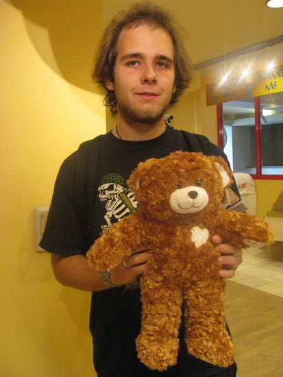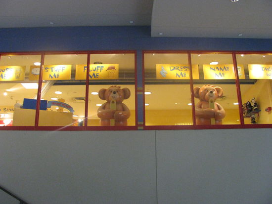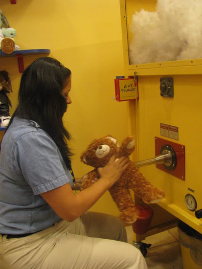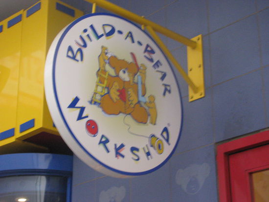 Bei Build-A-Bear kann man Kuscheltiere selber machen. Zuerst muss man sich eine leere Stofftierhülle aussuchen. Danach wird das Stofftier mit Watte befüllt. Natürlich genauso wie man's gerne mag. Von ganz weich bis extrem hart. Für ein kleines Kind zum Kuscheln war ein weicherer Teddy natürlich von Vorteil. Nach dem Befüllen bekommt das Stofftier dann noch ein Herz eingepflanzt, das man vorher auf beiden Seiten küssen muss. Nach belieben kann man auch noch Sound-Effekte einbauen, worauf Robin aber verzichtete, da diese ja nur störend und nervig sind. Nun wird es Zeit den Bären zuzunähen. Sobald das Stofftier dann zugenäht ist, ist es fast fertig. Man kann es noch online registrieren und taufen lassen. Die Registrierung ist dafür da, dass falls der Bär verloren geht und von jemandem gefunden wird, können Build-A-Bear den Besitzer eventuell ausfindig machen und den Bär zurückgeben. Nach der Taufe bekommt man auch noch eine Geburtsurkunde, mit der man auch lebenslange Garantie in der Build-A-Bear Tierklinik hat, die die Stofftiere reparieren, wenn etwas kaputt geht. Wenn man dies alles fertig hat, wird das fertige, getaufte Stofftier in einem Haus-ähnlichen Karton verpackt und ist bereit mitgenommen zu werden.