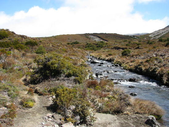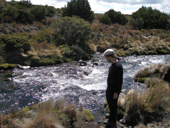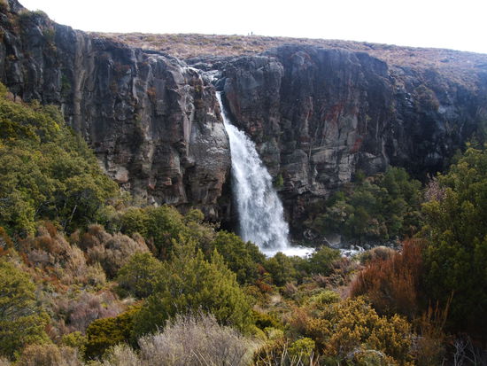 Heute sollte schon der letzte Tag unserer Tour anbrechen. Erneut sind wir die letzten und begeben uns auf eine nunmehr 14km lange Strecke. Die Landschaft entpuppt sich heute als anspruchsvoller, als die von gestern. Heute können wir sie auch einmal genießen, da unsere Rucksäcke doch schon um einiges leichter geworden sind. Jedoch steckten uns auch zwei Tagesmärsche in den Knochen wodurch wir erneut relativ langsam waren. Nachdem Robin gestern ziemlich erschöpft war trug Laura heute wieder mehr in ihrem Rucksack. Außerdem machten wir auf unserem Weg zwei kleine Abstecher. Einer davon führte uns zu einer historischen Hütte, die außerordentlich gut in Schuss war. Danach ging es weiter über scheinbar endlose Ebenen, die nur von vereinzelten Hügeln unterbrochen waren. Leider mussten wir alle diese Hügel wieder hinauf. Den ganzen Tag sollten wir eine wunderschöne Aussicht auf die Vulkane haben. Nachdem wir dann etwa an der Mitte unserer Strecke waren kamen wir an eine weitere Abzweigung. Wir entschlossen uns einen weitern Umweg zu gehen um unsere Mittagessen an einem weitern See zu uns zu nehmen. Dies war ganz zum Missfallen Lauras, die am liebsten sofort Mittag gegessen hätte und für die die Seen, allein aus dem Grund weil sie so abseits gelegen hatten einen negativen Hauch hatten. Nach geschlagenen 20 Minuten Weg, die von Lauras Gemecker gefüllt waren kam sie dann letztendlich doch zu ihrem Mittagessen. Der See war zwar ganz schön hatte sich aber nervlich sowohl für Robin als auch für Laura nicht 100%ig gelohnt. Zurück von unserem Umweg gingen wir dann weiter in den Wald. Der Rest der Strecke sollte sich erneut endlos ziehen, besonders weil wir erneut einen Umweg einschlugen um einen von etwa 1000 Wasserfällen zu betrachten, die wir in unserer Zeit in Neuseeland sehen würden. Der Wasserfall war ganz schön auch wenn erneut die Erschöpfung anfing überhand zu nehmen. Nach scheinbar 6 Stunden endlosen Wanderns kamen wir endlich wieder in Whakapapa Village an. Dort holten wir beim DOC-Center unsere Sachen ab und fuhren auf einen Campingplatz. Wir gönnten uns diesmal sogar einen mit warmen Duschen und einer Waschmaschine, da sowohl wir als auch unsere Kleider eine ordentliche Wäsche nötig hatten. Auch heute fielen wir früh in unser Bett, diesmal handelte es sich jedoch wieder um unseren geliebten Van.