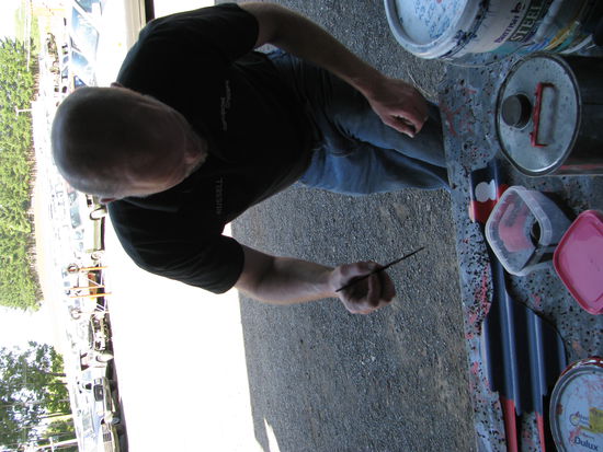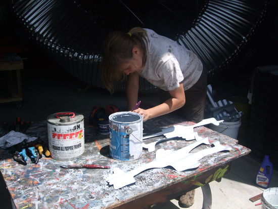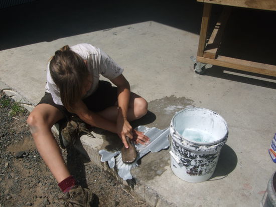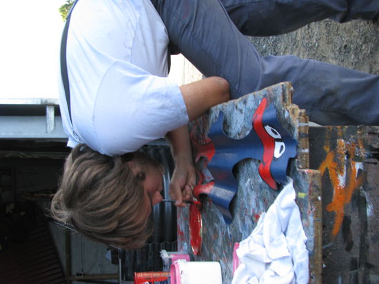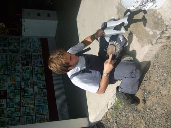 Pukekotag!! Nachdem wir eine Weile überlegt hatten welches Motiv unseren Eltern am besten gefallen würde entschlossen wir uns jeweils einen Pukeko aus Wellblech anzufertigen. Pukekos sind in Neuseeland einheimische, bedrohte Vögel. Als wir in um 9:00 Uhr in die Werkstatt kamen hatte Russel bereits die Vögel grob ausgeschnitten, unsere erste Aufgabe war es also die Ränder mit kleineren Zangen so gut wie möglich nachzufahren. Wir knipsten also das überstehende Wellblech ab bevor wir den Rand glatt feilten. Das Feilen war wichtig, da sonst die Farbe an den Rändern nicht gut halten würde und die Kanten sonst zu scharf gewesen wären. Nachdem wir damit fertig waren, zeigte uns Russel einen Weg wie wir das Wellblech schrubben mussten. Wir schrubbten unser Wellblech mit einer speziellen Seifenlösung, da normalerweise auf Wellblech eine Schutzschicht ist, die jedoch zum bemalen abgerieben werden muss. Da unsere Vögelchen jetzt schon ziemlich nass geworden waren und das Zeug mit dem wir geschrubbt hatten auch wirken sollte, legten wir sie in die Sonne zum trocknen. Währenddessen gönnten wir und ein Ginger Beer und leisteten Sheryn in der Küche Gesellschaft. Nach etwa 20 Minuten waren unsere Vögel dann so weit trocken, dass wir sie mit der ersten Schicht Farbe bemalen konnten. Da Pukekos blau sind wählten auch wir ein schönes Blau mit dem wir unsern Vogel von Kopf bis Fuß einpinselten. Pünktlich zum Mittagessen hatten wir die erste Schicht auf der ersten Seite abgeschlossen. Zu unserer großen Freude gab es zu Mittag Lasagne. Ein Gericht, das wir beide sehr gern essen und seit unserer Ankunft in Neuseeland nichtmehr gegessen hatten. Nach dem Mittagessen sammelten wir unsere Pukekos wieder ein und malten die andere Seite an. Danach kontrollierten wir die erste Seite und besserten die Stellen aus, an denen die Blau nicht gedeckt hatte. Erneut hieß es dann für uns warten bis die Seiten trocken werden. Danach trugen wir erneut nur auf einer Seite die zweite Grundfarbe auf. Die zweite Grundfarbe war rot, da die Beine sowie der Schnabel rot werden mussten. Zusätzlich trugen wir bereits das Weiß für die Augen auf. Nach weiterem scheinbar ewigem Warten konnten wir dann endlich die zweite Seite rot anmalen. Da der Sonnenschein etwas nachließ verlängerte sich unsere Wartezeit. So gegen 5:00 Uhr konnten wir dann endlich mit dem schwierigsten Teil anfangen. Dem Malen der schwarzen Umrandung, da unser Pukeko im Comicstil gehalten werden sollte. Besonders der schwarze Rand gestaltete sich als besonders schwierig, da wir ihn eigentlich möglichst dünn auftragen wollten. Da Robin jedoch eine etwas zittrige Hand hatte und sein Rand ungleichmäßig dick wurde entschloss er aus Enttäuschung seinen Pukeko nicht beenden zu wollen und am naechsten Tag weiter zu machen. Nach gutem Zureden und einem Blick auf Distanz stellte Robin erstaunt fest, dass der Pukeko doch besser war als er erwartet hatte. Somit arbeiteten wir bis etwa 8:00 Uhr an unseren Vögelchen weiter. Als Robin dann die Kuh reinholen und die Enten sowie Perlhühner füttern ging besserte Laura auf Robins Wunsch hin seinen Pukeko an ein paar Stellen noch ein wenig aus. Am Ende waren wir beide äußerst zufrieden mit unseren Werken und legten sie über Nacht zum Trocknen hin. Danach bereiteten wir mit Sheryn noch eine Pflegeanweisung für Pukekos vor. Sheryn versprach uns weiterhin noch eine neuseeländische Geburtsurkunde für unsere Vögel vorzubereiten. Dafür mussten wir uns unter anderen auch einen Namen für die Kleinen überlegen. Nachdem alldies erledigt war, gingen wir alle Farbe abwaschen, die aus Versehen auf uns gelandet war und danach zu Bett.