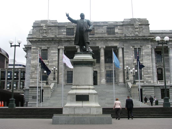 Erneut standen wir heute früh auf, da wir weitere Bewerbungen abgeben wollten. Wellington ist scheinbar eine Stadt die nur so vor Cafés sprudelt. Allerdings ist das auch eine Tatsache, da es in Wellington mehr Cafés pro Einwohner gibt, als in New York. Um die Mittagzeit entschlossen wir uns das Parlament und das Beehive (Bienenkorb), den exekutiven Flügel, zu besichtigen. Wir kommen genau pünktlich zu einer Führung an, die alle halbe Stunde beginnen. Zuerst mussten wir jedoch durch eine Sicherheitskontrolle durch. Unsere Taschen gaben wir ab zum Röntgen, während wir selbst durch einen Metalldetektor durchschritten. In dem Moment fiel Laura ein, dass sie vielleicht ihr Taschenmesser in ihrer Handtasche haben könnte. Kurz darauf wurde sie auch von den Sicherheitsangestellten gefragt ob sie denn ein Taschenmesser bei sich habe. Sie sagte, dass dies möglich sei, sie es aber nicht genau wisse, was ja ein typisches Frauenproblem ist und sich daran machte ihre Tasche zu durchsuchen. Als der Übeltäter gefunden war, bot sie an ihn bei den Sicherheitsbeamten zu lassen. Diese checkten lediglich wie leicht sich das Messer öffnen ließe. Da es bei halbem Öffnen wieder zurückfederte konnte Laura es mitnehmen (ein Schweizer Taschenmesser im Parlament!!). Sie wurde lediglich angewiesen das Messer in ihrer Tasche zu behalten. Wir mussten unsere Taschen sowieso abgeben, wodurch es keinen Unterschied machte. Die Führung war sehr interessant auch wenn wir etwa fünf Minuten verpasst hatten dadurch, dass wir dann letztendlich doch ein wenig zu spät waren. Die interessantesten Teile waren der Versammlungsraum, der Maoriepräsentanten und das Kunstwerk, das mitten in einer Art Lounge hing, das Neuseeland verkörperte. Der Maori-Raum war vollkommen mit Schnitzereien verziert und stellte die einzelnen Stämme dar. Auch hiervon gibt es leider keine Bilder, da fotografieren nicht erlaubt war. Da heute ein Dienstag war tagte sogar das Parlament und da heute eine "öffentliche" Fragestunde war, konnten wir uns sogar das Parlament aktiv ansehen. Wir packten die Gelegenheit sofort beim Schopf und sahen uns den Zirkus an. Anders konnte man dies nicht beschreiben. Während von der Opposition Fragen gestellt wurden aß John Key, der Premierminister, genüsslich TicTacs und verteilte diese an seine Parteimitglieder. Als er dann an der Reihe war machte er sich über die Fragen lustig und verhöhnte die Opposition, was natürlich von seiner Partei mit Applaus und Jubeln unterstrichen wurde. Wenn es jedoch gegen John Key ging verhielt sich die Gegenpartei genauso. In einem Zeitraum von 20 Minuten leerte John Key 3 Wassergläser. Auch schien er nie zuzuhören, was eigentlich an Fragen an ihn gestellt wurde. Als dann ein Parteimitglied von John Key zu Wort kam musste sich dieser erst einmal das TicTac aus den Backen puhlen bevor er reden konnte. Nach etwa einer halben Stunde hatten wir uns genug gewundert und amüsiert und verließen das Parlament. Aus unserem "kurzen" Abstecher ins Parlament wurde ein halber Tagesausflug wodurch wir danach nur noch aßen und zu Bett gingen.