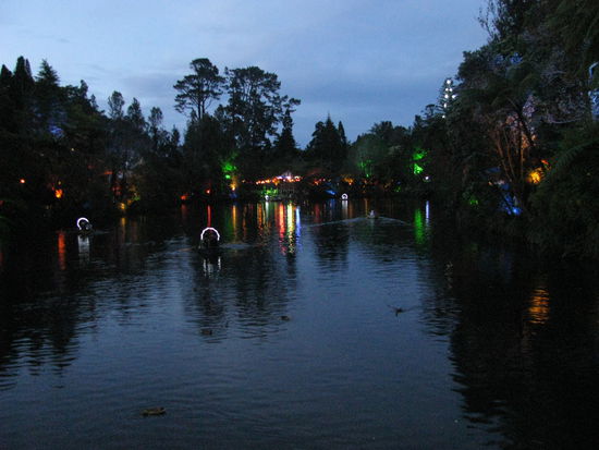 Heute sollten wir unser Ziel New Plymouth erreichen. Nachdem wir am Morgen aufgestanden waren und noch einen kurzen Abstecher bei einem weiteren Leuchtturm gemacht hatten, den man leider nicht begehen konnte, fuhren wir weiter Richtung Stadt. Um die Mittagszeit erreichten wir dann auch unseren Bestimmungsort. Zuerst wollten wir die Gelegenheit nutzen und unsere Vorräte bei Pak'n'Save aufstocken. Danach entschlossen wir uns auch noch einen Ersatzkanister fuer Benzin zu kaufen, damit wir für die Südinsel ein wenig Ersatzbenzin hätten. Wir hatten inzwischen von zu vielen Reisenden gehört, die stehen geblieben waren oder beinahe stehen geblieben wären und dann extrem teuer tanken mussten. Nach unserem Einkauf gingen wir ein wenig die Stadt erkunden. Auf Anraten von Maria und Alex, zwei Mädels die wir auf unseren Reisen kennengelernt hatten, fuhren wir danach ans East End. Das East End ist ein Surfstrand in einem Außenbezirk der Stadt. Dort angekommen nutzte Robin erst einmal die Möglichkeit zu duschen bevor wir sonst etwas unternahmen. Danach gingen wir noch für mehr als eine Stunde am Strand entlang spazieren. Zurück am Auto kochten wir uns eine Suppe, da wir beide nicht sehr hungrig waren. Das Ganze sollte jedoch in einer mittelschweren Katastrohe enden, da wir im Bett aßen und Laura es irgendwie schaffte sich ihre Suppe fast komplett über den Fuß und das Schienbein zu kippen. Nach mehreren Flüchen drückte sie dann Robin die Suppe voller Wut in die Hand, wobei sich dieser auch noch ein wenig verbrannte. Laura rannte dann unter die Fußdusche am Strand und kühlte sehr lange ihre jetzt schon zu Blasen werdende Haut ab. Nach dem kühlen ging sie zurück und salbte sich das Schienbein und den Mittelfuß mit einer Brandsalbe ein. Robin hatte in der Zwischenzeit versucht das Bett zu retten, das beinahe in Zwiebelsuppe schwamm. Wir zogen es jedoch einfach ab und wollten es in die Wäsche tun, da nichts mehr zu retten war, es war alles durchweicht. Lustlos löffelten wir dann unsere Suppe aus bevor wir uns auf den Weg zu der Ausstellung "Lights on" machten. Trotz lädierten Fußes konnte Laura die vorgegebene Strecke laufen. Das ganze wurde von der Stadt New Plymouth organisiert und sollte etwa einen Monat dauern. An jedem Abend in diesem Monat sollten zwei Konzerte stattfinden und Lichter leuchten. Die Strecke war durch einen öffentlichen Park geführt und einfach unbeschreiblich schön. Es war ein Weihnachtsbaum aufgebaut worden, eine Glühwürmchenhöhle war vorhanden. Boote, die auf dem See fuhren wurden ebenfalls mit Lichtern dekoriert waren. Ein lustiger Teil der Strecke, in dem fluoreszierende Steine auf dem Boden lagen und Bälle von einem Trapez hingen. Dies gefiel besonders Laura gut. Im Allgemeinen waren wir äußerst begeistert von all den Lichtern und Ideen. Besonders gefiel uns, dass der Eintritt dazu frei war. Wir verbrachten mehrere Stunden in der Ausstellung und fuhren gegen 23:00 Uhr an unseren Schlafplatz zurück.