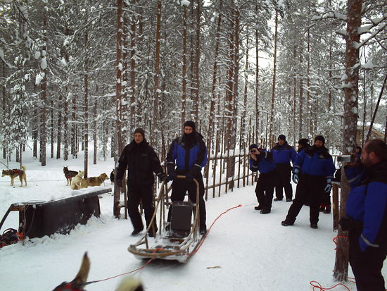 Nach einer Erklärung über das Leben in der Huskey-Farm auf englisch durfte jeder Teilnehmer eine kleine Runde mit einem Hundegespann fahren.
