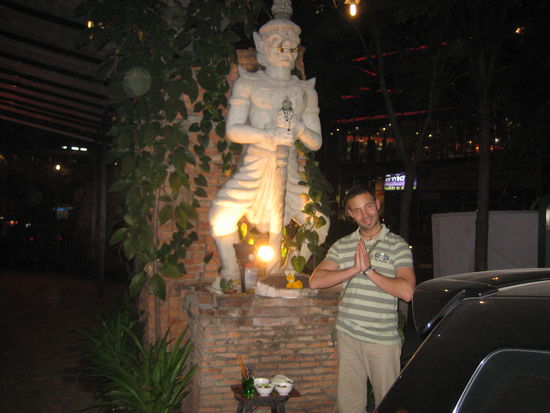 Nach ewigem Flug ueber Dubai, wo es sogar Wasser zu verschenken gab, sind wir endlich in der lungenzerstoerenden Stadt Bangkok angekommen. Nachdem uns unser Taxifahrer irgendwo auf der Koasanroad rausgelassen hat, haben wir uns ein Zimmer fuer die Nacht gesucht, das preislich einigermassen ok war. Das Hello-Guesthouse war fuer die Lage nicht nur zu teuer, das Personal war auch extrem unfreundlich... kann ich jedem empfehlen, der auf Service ueberhaupt keinen Wert legt. Naja, abends waren wir dann noch schoen aus mit einigen anderen Europaeern und haben es sogar geschafft intelligent eine Pingpongbar zu umschiffen.