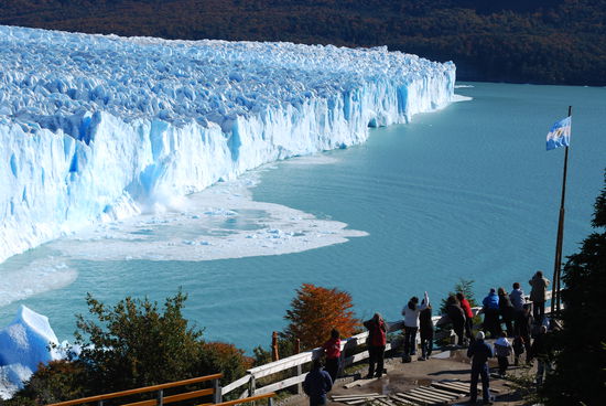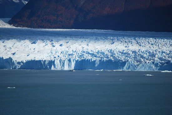 Dieses Eis fasziniert ohne Ende, man kriegt nicht genug davon. Und es knirscht und knackt ständig, manchmal kracht es auch ziemlich laut, aber hier auf der Nordseite sehe ich kein Stück abbrechen. Wie fast überall in Argentinien an den touristischen Highlights steht auch hier an Bord des Schiffes ein professioneller Fotograf bereit, der gegen Geld schöne Fotos von einem macht, sie anschliessend in eine DVD mit jede Menge anderem Fotomaterial einbettet und sie zuverlässig noch am gleichen Abend ins Hotel liefert. Diesen Service nutze ich an diesem besonderen Ort auch gern.
