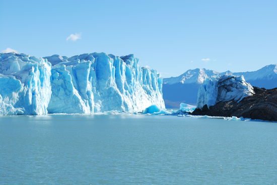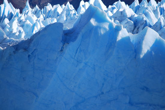 Ausgerüstet mit Krampen kann man auch einen Mini-Trek direkt auf dem Gletscher machen, aber mir reicht der Anblick völlig. Hier auf der Südseite, wo jetzt mittags volle Pulle die Sonne draufknallt, knírscht, kracht und ballert es jetzt wirklich dauernd und ich sehe auch Stücke abbrechen, nur hab´mal da jeweils genau in dem richtigen Zeitpunkt die Kamera schussbereit ! Kunststück !!! Ich wandere alle vorhandenen Wege ab. Zuletzt 2006 ist ein riesiges Stück Eis abgebrochen und das kann man sich auf www.youtube.com ansehen. Suchbegriff: Perito Moreno.