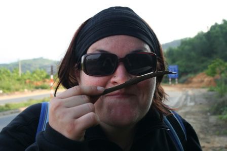 An unserem ersten gemeinsamen Abend mit den zwei Fahrern sitzen wir gemütlich beim Essen, als Hung eine ½ Liter Vodka bestellt. Wir denken uns noch nichts dabei und schwups stehen 2 volle Gläser vor uns. Wir haben in nicht ganz 1 Stunde, fast 1 Liter Vodka pur zu Viert getrunken. "Mir hon's gad a kle gspüra möga." Auf dem nachhause Weg sind wir quer durch die Wiese gelaufen. Als Conny was rascheln hörte (vermutlich ein Gekko) sprang sie wie ein Gaisbock auf und davon. Leider hat sie die falsche Abzweigung erwischt und musste dann noch einen Umweg machen, während ich schon vor der Haustüre auf sie wartete.