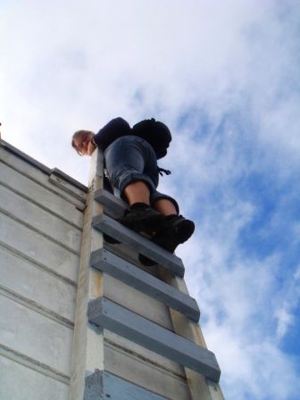 Über eine schmale Leiter geht es aufs Dach vom Haus wo Gina wohnt!