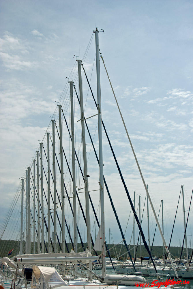 Mit rauschender Bugsee und voll geblähtem Segel strebt die Cleo der gegenüber liegenden Marina Sukošan zu. Ein herrlicher Segelwind bläst aus Süd/Südwest und wir mögen gar nicht so schnell unser viel zu nahes Ziel erreichen. Also absolvieren wir ein paar Wenden und schwelgen in der Segelei "auf der Stelle", bevor wir dann doch in die größte Marina Kroatiens einlaufen. Hier geht alles streng nach Plan zu: bereits bei der Einfahrt weist uns ein am grünen Leuchtfeuer stehender Marinero mit der Hand eine Richtung, wobei er uns durch den Wind unverständliche Worte zuruft. Der zugewiesene Platz gefällt uns nicht sonderlich, denn er liegt unmittelbar neben der Tankstelle. Wir stellen uns also dumm und ändern den Kurs in Richtung schönerer Liegeplätze, worauf ein weiterer Marinero uns von der Tankstelle aus etwas zuruft, zu seinem Schlauchboot eilt, in das schwankende Gummigefährt springt und unser Boot ansteuert. Ich stoppe auf und wir klären hier im Hafenbecken bereits die geplante Dauer unseres Aufenthaltes, die Länge unseres Bootes und bekommen nach einem Handytelefonat des Helfers die Stegnummer 23 zugerufen, an welcher uns bereits ein weiterer Marinero erwarten würde. - Offenbar sollten wir gar nicht neben der Tankstelle liegen, sondern uns dort vom "zentralen Verteilungs-Marinero" nur einen Liegeplatz zuweisen lassen.