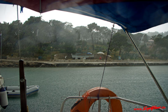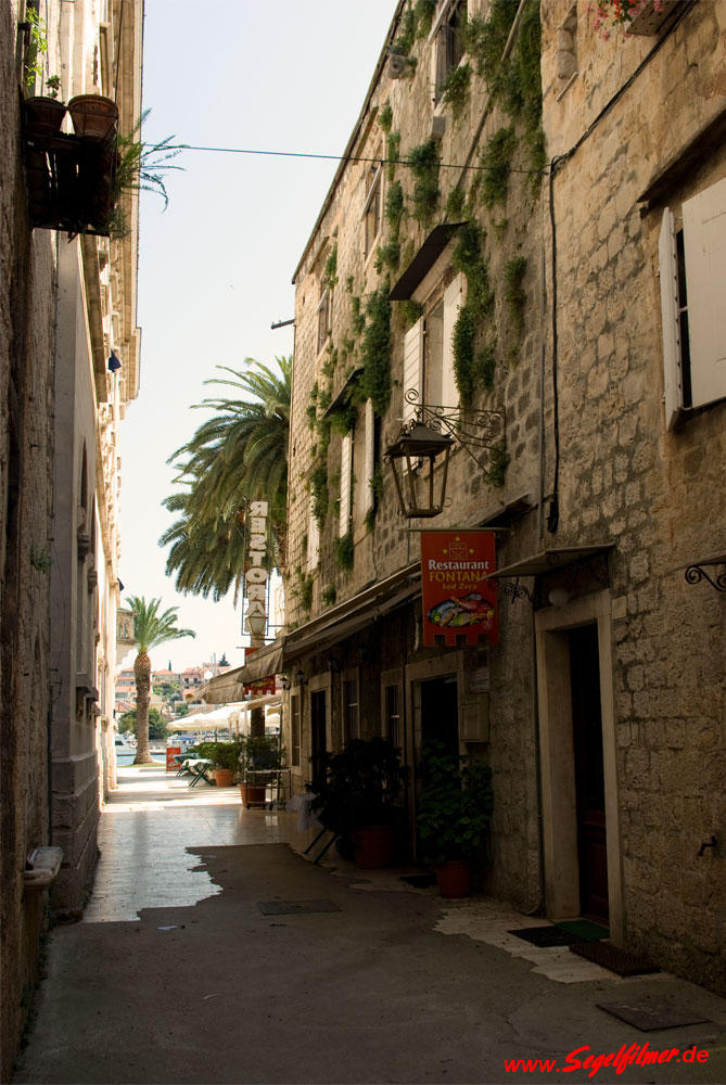 Hvar ist eine anmutsvolle Stadt, an deren Hafen sich unmittelbar steile Hänge anschließen. Deshalb wurden die Gebäude eng an die Felsen gebaut und als Zuwege führen zahllose Treppen zu den Häusern. Die Stufen erscheinen jetzt wie extra angelegte Katarakte, durch die Wasserfälle ihre Wassermassen zu Tale schicken. - Sogar in dieser Ausnahmesituation verbreitet die Kulisse der Häuser ihren zauberhaften Charme und so ist es schließlich nicht weiter tragisch, dass wir unseren Aufenthalt an diesem inspirierenden Ort wetterbedingt verlängern.