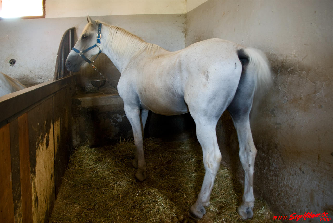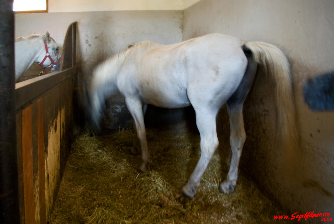 Wir verschwinden in einer etwas dunkleren Trainingshalle, wo einige Reiter gerade auf dem Rücken ihrer Tiere den stolzen Schritt der dafür besonders berühmten und gerühmten Pferde trainieren. Die eleganten und anmutigen Pferde tun das mit einer Grazie und in ihren Augen spiegelt sich dabei die Sanftmut, die diesen Schimmeln eigen ist.