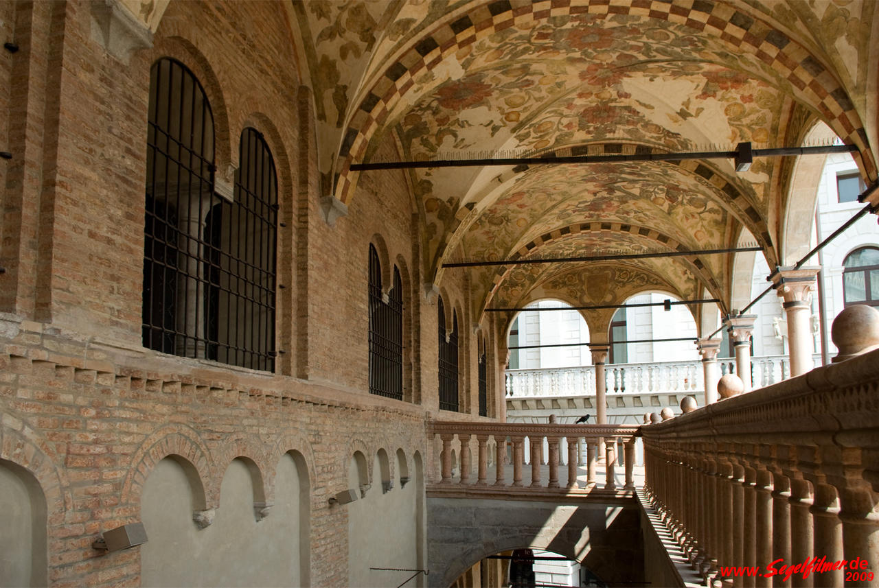 Doch in Padua gibt's ja noch viel mehr zu besichtigen. Wir steuern jetzt den Palazzo della Ragione an, der früher Sitz des Stadtvogts und der Gerichtsbarkeit war. Im ersten Stock des Gebäudes ist ein riesiger Saal zu besichtigen. An den Wänden sind massenhaft bunte astrologische Motive. Außer einem Fernseher in einer Ecke, auf dem ein Beitrag über eben diesen Palast gezeigt wird, einem riesigen dunklem Pferd aus Holz und neuerdings dem Pendel von Foucault ist der Saal leer.