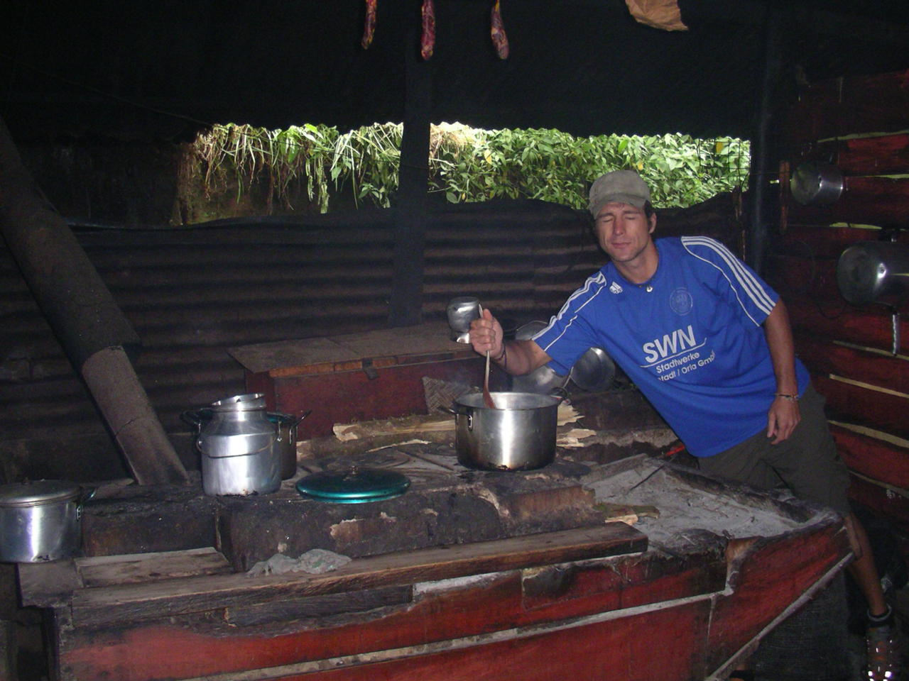 Bevor es dann durch schmale Waldwege zum 2860m hohen Gipfel "La Montaña" geht, braucht man, na klar, erst einmal eine kleine Stärkung. Marcus zauberte uns gleich aus seinen Hexenkessel heisse Schokolade und ein Stück Käse