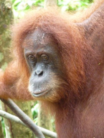 Am zweiten Tag haben wir uns zur Fuetterung der Halbwilden Orang Utans aufgemacht. Mann muss zuerst den Fluss mit einem sehr wackligen Boot ueberqueren. Und dann ca 15min durch den Jungel zur Fuetterungsplattform hochlaufen. Oben angekommen haben wir zuerst eimal gewartet, und weitergewartet.