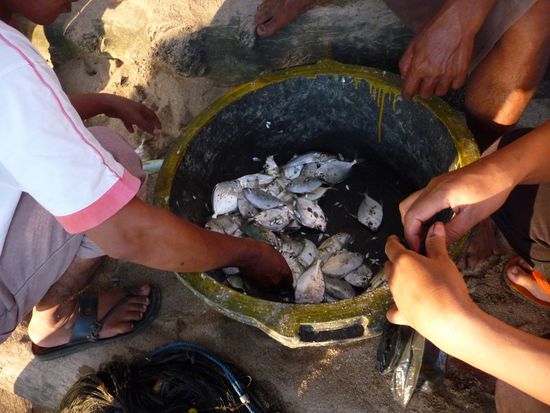 Direkt vor unserer Unterkunft konnten wir den Fischern zusehen, wie sie die Netze aus dem Wasser zogen. War sehr interessant mitanzusehen. Die Netze wurden zuerst mit einem Boot 1.5km aufs Meer hinaus gefahren, und dann von ca. 8 Maennern wieder an Land gezogen. Dies dauerte bestimmt 2h. Sie hatten fuenf Netze, und jedes Netz wurde zwei mal am Tag hinaus gebracht. Richtig viel Arbeit also. Es war dann jedes mal sehr spannend, wieviel gefangen wurde. Manchmal war recht viel Fisch drinn, manchmal aber auch fast gar nichts. Der Fang wurde dann noch am Strand aufgeteilt und zum Teil auch gleich verkauft.