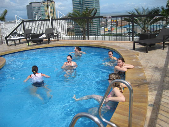 Als erstes mussten wir uns natürlich im Pool auf dem Dach erfrischen.