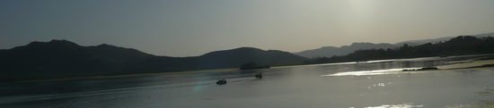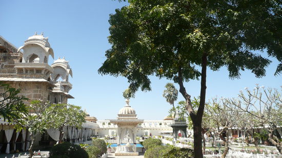 Ich entdecke also Udiapur und gegen Nachmittag laufe ich zum Ufer des Sees um einige Stunden im dort gelegenen Café ambrai zu verbringen. Dieses hat eine parkähnliche Außenfläche, man sitzt auf verschnörkelten Eisenstühlen unter schattenspendenen Grün und ich genieße leckeren schwarzen Tee aus formschönen Kännchen, den Blick schweifen lassend über die Ghats, den Palast und die vorgelagerten Palastinseln. Langsam beginnt die Sonne unterzugehen und der weiße Stein des Palastes färbt sich in ein warmes Gelb-Orange. So lässt es sich leben!