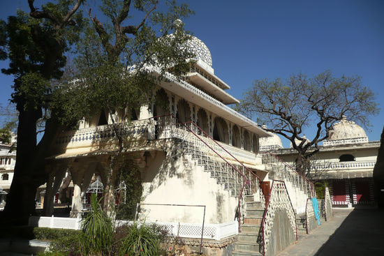 Am nächsten Tag breche ich sogleich in Richtung des Palastes auf. Die kommenden Stunden verbringe ich also damit das riesiege Gebäude mit seinen zahllosen Türmchen, Kuppeln, Toren und wunderschönen Verziehrungen zu erkunden. Der Bau wurde einst von Maharadscha Udai Singh II. iniziiert und dann im Laufe der Zeit von zahlreichen anderen Maharadschas ergänzt und fertig gestellt. Der Palast beinhaltet zahlreiche interessante Museen und durch die unzähligen Fenster erhält man tolle Aussichten auf die Stadt beziehungsweise den See und die Hügel am Horizont. Das Innere ist prunkvoll gestaltet, alles glänzt und glitzert. Die Wände sind mit zahlllosen Mosaiken versehen und es ist eine wahre Freude, durch diese Gemäuer zu wandeln. Ich verlasse den Palast durch den Innenhof, der gerade für eine offensichtlich reiche und große Hochzeit geschmückt wird. In mir keimt die Hoffnung auf, von dieser etwas in der Stadt mitzubekommen und wie sich in den kommenden Tagen zeigen wird, werde ich nicht enttäuscht.