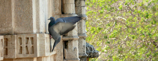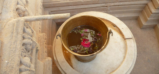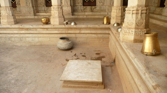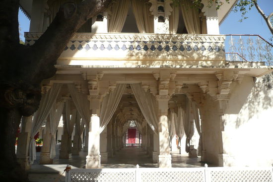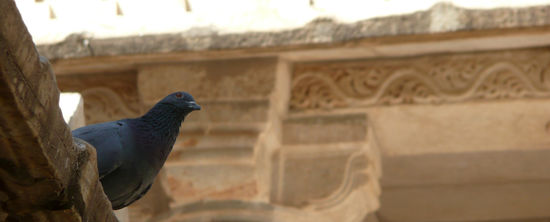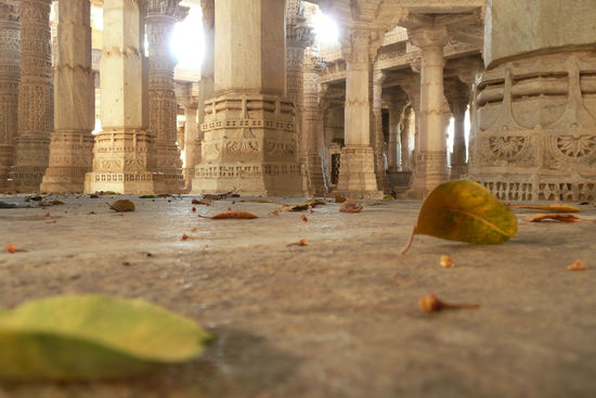 Ich jedenfalls betrete schon bald den Tempel und berühre mit meinen blanken Füßen den agenehm kühlen weißen Marmor. 29 Hallen aus weiß meliertem Stein gilt es zu erkunden, prunkvoll verzierte Wand- und Deckenreliefs werden von rund 1450 filigran gehauenen Säulen getragen. Jede ist individuelle gestaltet, erzählt ihre eigene Geschichte und zeigt ein eigenes, phantastisches Muster. Durch die partiell offene Decke scheint die strahlende Sonne und schafft ein wunderbares Licht- und Schattenspiel auf dem glänzenden Boden. In der Mitte des Tempels steht ein alter, verwachsener Baum, seine Blätter werden durch den Wind in die verschiendenen Hallen des Tempels getragen. Kleine und größere Vögel starten und landen auf dem Gesimsen, ihr Flügelschlag hallt in der Stille wieder. Überall stehen kleine, von der Witterung vergilbte Messingschalen und kleine Kannen; Rosenblätter schwimmen in mit Wasser gefüllten goldenen Bassins. An jeder Ecke gibt es neue Stillleben zu entdecken. Indien präsentiert sich an diesem Ort von einer gänzlich anderen Seite: ruhig, kontemplativ und sanft.