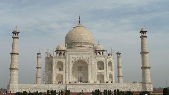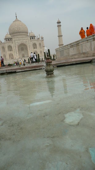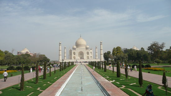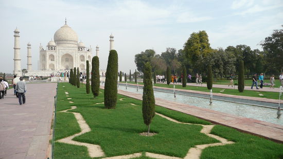 Als wir aufbrechen fühlen wir uns etwas fitter. Am Eingang werden wir gefilzt wie Schwerbrecher, zumindest fühlen wir uns unweigerlich so. Detektoren durchschreiten, Körper werden abgetastet. Wir betreten das Gelände und sind endlich da - wie viele andere auch. Farbenfrohe Saripunkte schwirren auf grünen Rasenflächen und vor weißem Marmor. Vor uns erhebt sich jenes Gebäude, das wohl auf ewig unmittelbar mit Indien verbunden zu sein scheint. Der weiße Marmor erstreckt sich in den Himmel, befindet sich das Mausuleum doch erhöht auf einer großen Marmorplattform. In dem vorgelagteren Wasserlauf spiegeln sich die großartige Kuppel und die weißen Minarette. Gehen die Fontänen an, verwischt das Bild und der Taj Mahal verblasst...