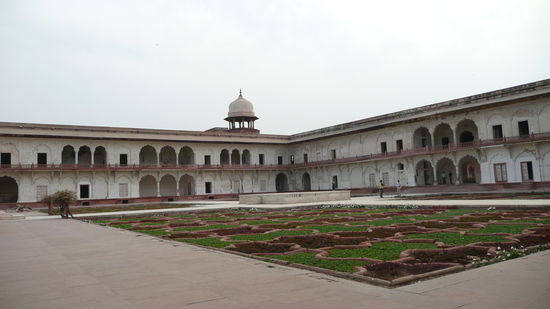 Kurz vor dem Fort kommt bei uns zweien die Übelkeit zurück, also entscheiden wir uns ein paar Minuten auf einer Wiese zu verweilen. An sich eine schöne Idee und ein wenig erholsam, doch schon bald gruppieren sich mehr und mehr Jugendliche um uns herum und es dauert nicht lange, da sind M., D. und ich eine wahrliche Attraktion für rund 20 Halbstarke. Da es offensichtlich ausgeschlossen ist, jemals seine Ruhe zu haben stehen wir wieder auf und betreten durch das große Amar Singh Tor die Fortanlage. Der imposante Gebäudekomplex liegt ebenfalls am Ufer des Yamuna, unweit des Taj Mahals. Erbaut wurde es im Jahre 1565 von Akbar, weiter entwickelt und zu einem Palast ausgebaut in den folgenden Jahren. Zu besichtigen gibt es verschiedenste Hallen, Moscheen, einen Spiegelpalast sowie einen Gartenbereich.