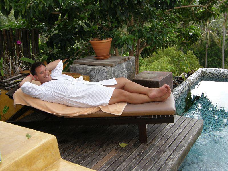 Von Sairee aus ging es dann los zu unserem letzten Stopp, der Insel Koh Nang Yuan. Sie ist Koh Tao direkt vorgelagert und befindet sich in Privatbesitz. Drei kleine, aber sehr grüne Felseninseln sind durch eine Sandbank verbunden, auf der man ein bisschen im Sand relaxen kann. Die Korallen fangen hier schon an, wenn das Wasser gerade knietief ist! Auch hier waren wieder jede Menge, ganz verschiedene Fische und vor allem auch Seegurken zu sehen. Wir sind teilweise durch ganze Fischschwärme geschwommen, die sich dann erst kurz vor uns aufgeteilt haben. Hier sind wir bestimmt eine ganze Stunde im Wasser geblieben. Das Gebiet war relativ groß und so vielfältig, wenn auch hier die Korallen nicht so bunt waren wie bei Koh Chang. Trotzdem waren wir einfach nur begeistert, es ist immer wieder so schön, sich einfach nur ruhig auf's Wasser zu legen und dies spektakuläre Naturkulisse zu betrachten! Nach zwei Stunden ging es dann mit dem Boot wieder zurück nach Koh Tao. Ein wunderschöner Tag ging in dieser atemberaubenden Villa zu Ende, in der man gar nicht anders kann, als sich unbeschreiblich gut zu fühlen!