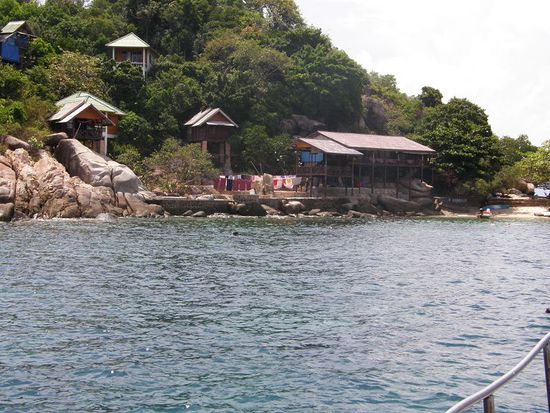 Die Unterwasserwelt war hier nicht so beeindruckend, wie wir es vom letzten Mal bei Koh Chang kennen. Dafür konnte man aber echte Haie sehen! Mir sind so drei oder vier Stück begegnet, echt beeindruckend! Dann hab ich es aber doch mit der Angst gekriegt - nicht wegen der Haie, sondern wegen der Wellen. Ich war ganz schön froh, als ich endlich wieder auf den Boot war. Micha hat sich schon Sorgen gemacht und war froh, als er mich endlich wieder gesehen hat. Wegen des Wellengangs wurde die Route dann auch geändert. Statt einmal die Insel zu umrunden haben wir umgedreht dann vor an einem Stück vor der Felsenküste gehalten. Hier konnten wir dann auch Korallen und jede Menge Fische sehen. Obwohl die Korallen relativ farblos waren, vor allem in verschiedenen Grau- und Brauntönen, war es total beeindruckend! Wir konnten ganz viele verschiedene Fische sehen, regenborgenfarbene, schwarze, weiße, blaue, kleinere und größere, auch einige Welse. Es ist so schön, mit den Fischen zu schwimmen. Unter Wasser kann man sogar hören (zumindest hatte ich den Eindruck), wenn sie an den Korallen fressen! Mit der Unterwasserkamera haben wir versucht, möglichst viel einzufangen, mal sehen, was daraus so wird! Von hier aus ging es weiter zur Sairee-Bucht. Ganz am nördlichen Ende der Bucht an den Felsen war wieder ein unglaubliche Unterwasserlandschaft zu beobachten. Das Meer war hier ganz ruhig und man konnte ganz entspannt alles anschauen. Teilweise waren die Korallen so dicht unter der Wasseroberfläche, dass wir uns gar nicht getraut haben, darüber zu schwimmen. Einige wissen die Natur aber scheinbar nicht besonders zu schätzen und haben sich tatsächlich direkt auf die Korallen gestellt, wirklich unglaublich! Wann das viele machen, gibt es diese bald nicht mehr und der Natur geht ein wahrer Schatz verloren ...