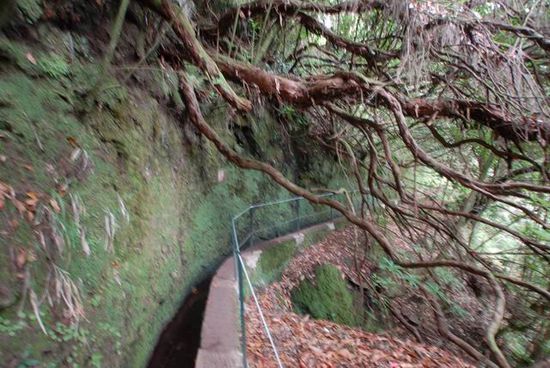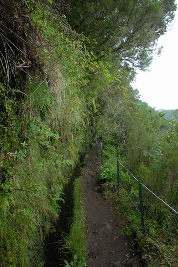 Zwischendurch marschieren wir in schwindelerregender Höhe über dem grünen Tal der Ribeira Grande ou de Sao Jorge. Nach dem vierten Tunnel (Durchgang) zieht Nebel auf.